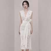 夏 女性のパーティードレスフローラルレースサッシノースリーブミディドレスVネックラインセクシーな女性スリムドレス サマー 夏物 花柄