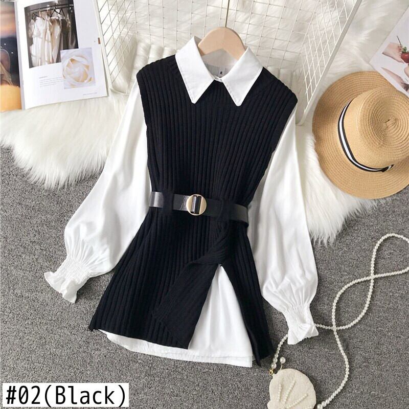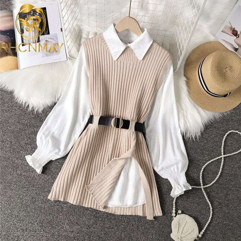 女性ツーピースセットスーツニットベストセーターベルト因果ブラウスランタンスリーブシャツスリムオフィス女性セット ハーネス 会社 学校 通勤や通学にも