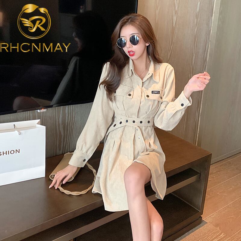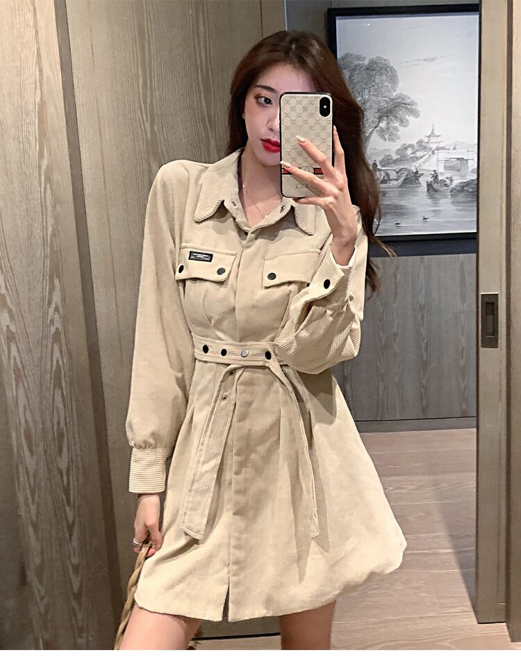 2021年秋ヴィンテージ女性ミニドレス長袖ショートドレスターンダウンカラーコーデュロイドレス ロング オータム 秋物 ビンテージ