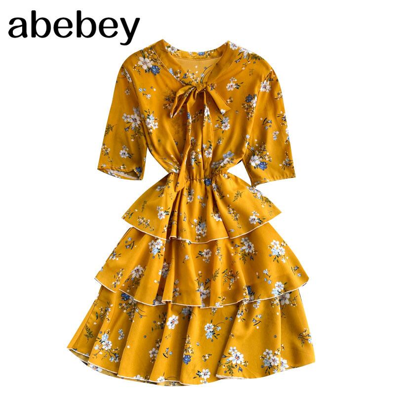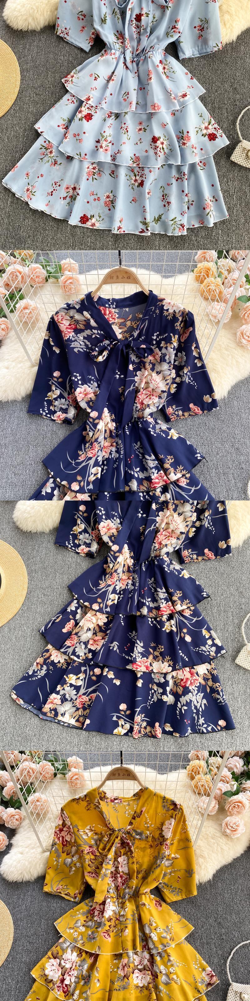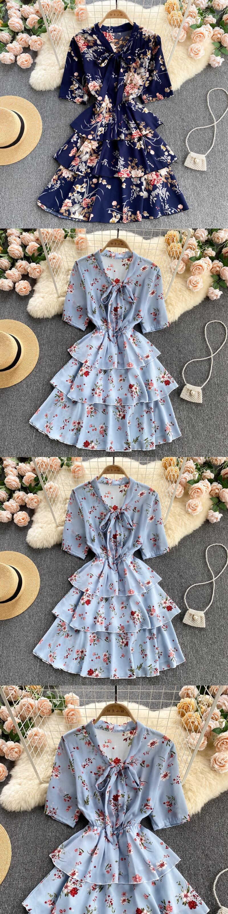 女性シフォンフローラルドレスフレンチスウィートボウカラーパフスリーブAラインドレスサマー自由奔放に生きるプリントバケーションミディサンドレス リボン 大人ガーリー キュート カジュアル 夏物 花柄