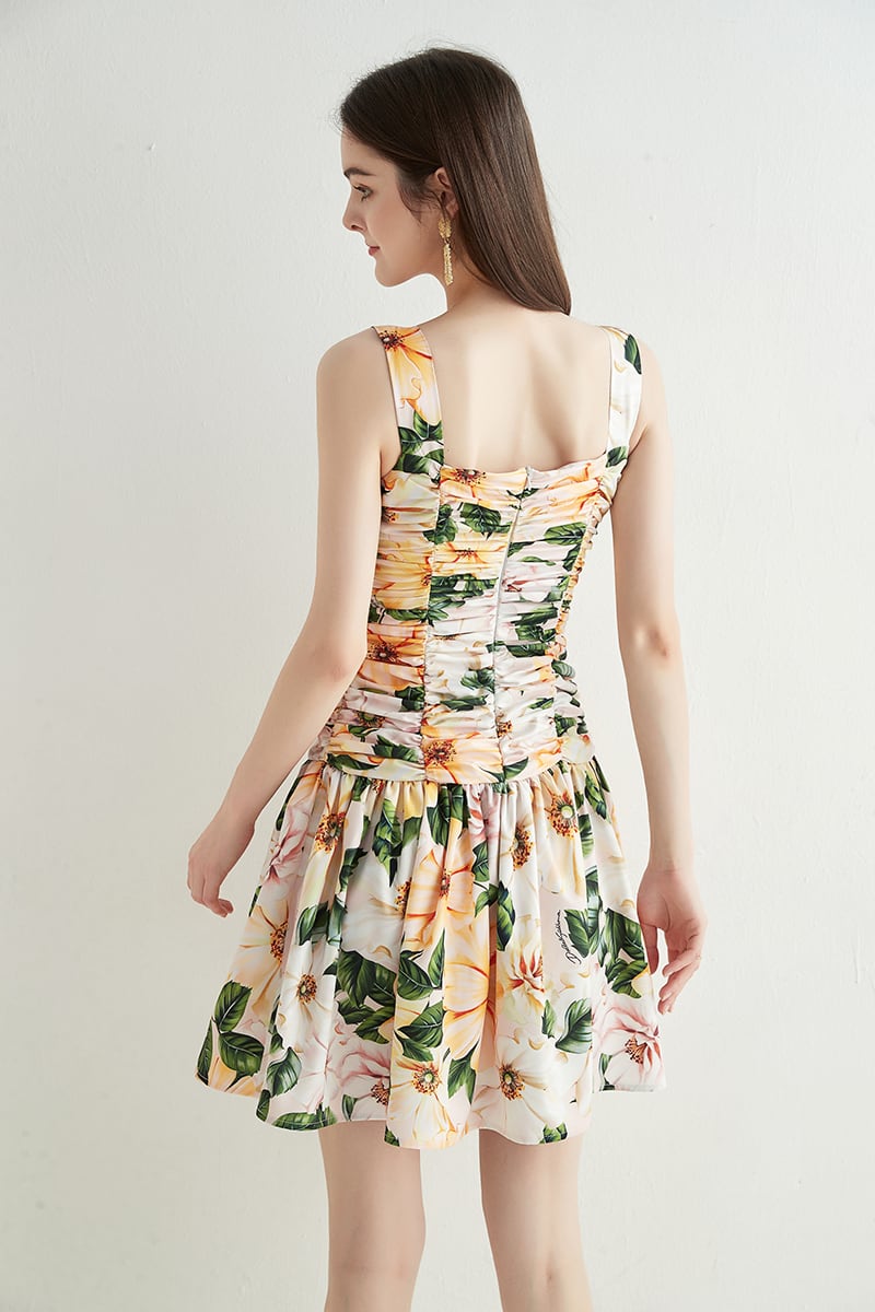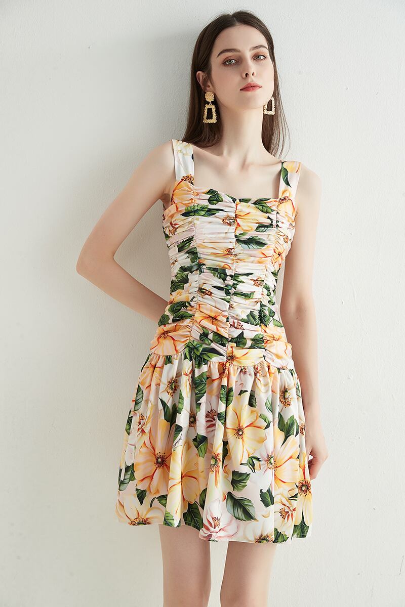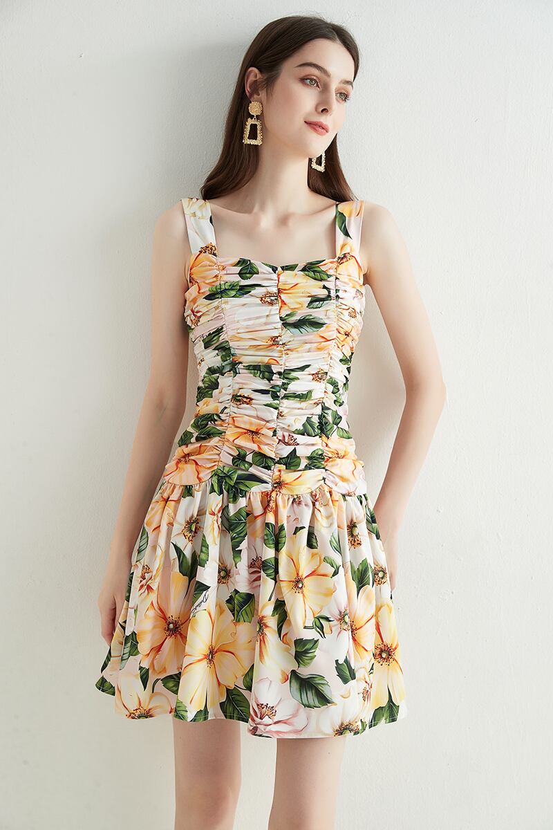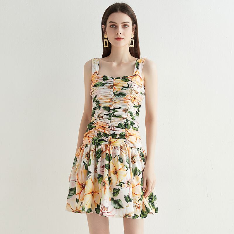 2021夏の女性のロマンチックな花プリントミニドレススパゲッティストラップノースリーブドレープホリデーAラインドレス サマー 夏物 フラワーデザイン