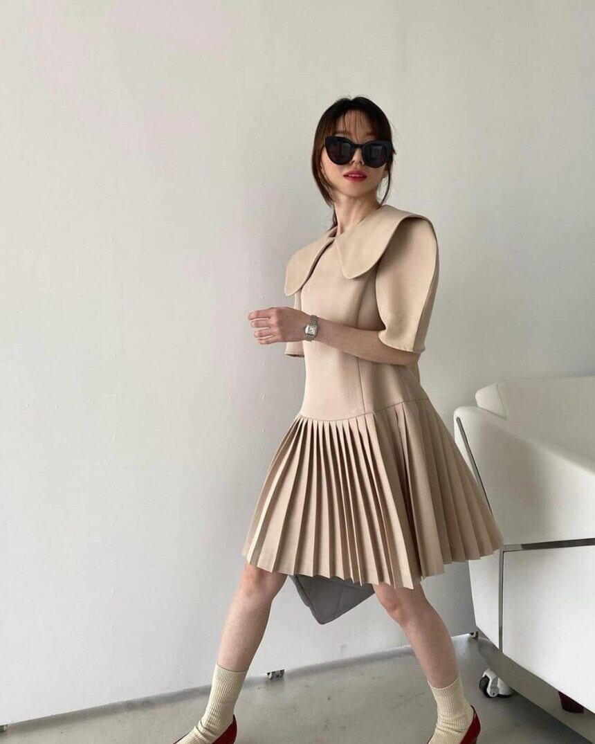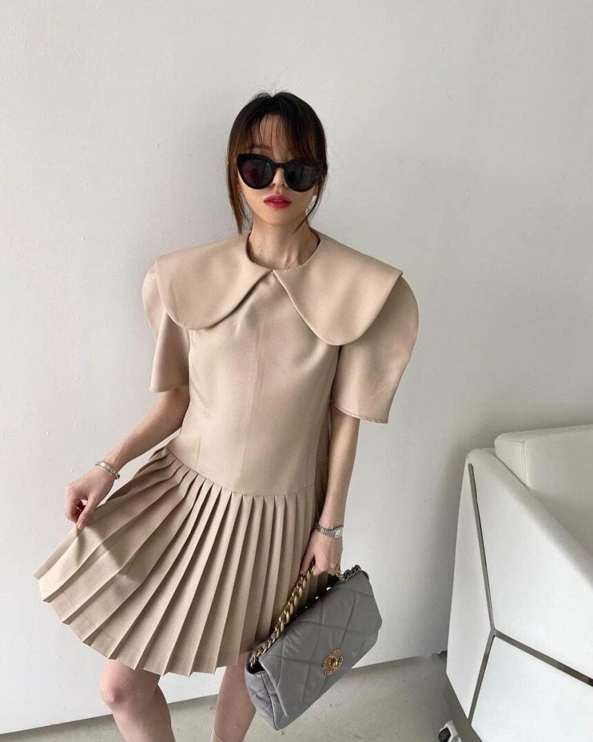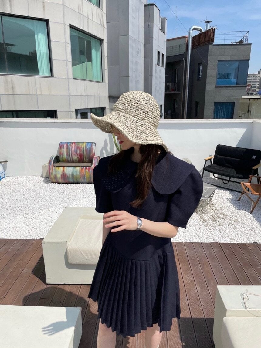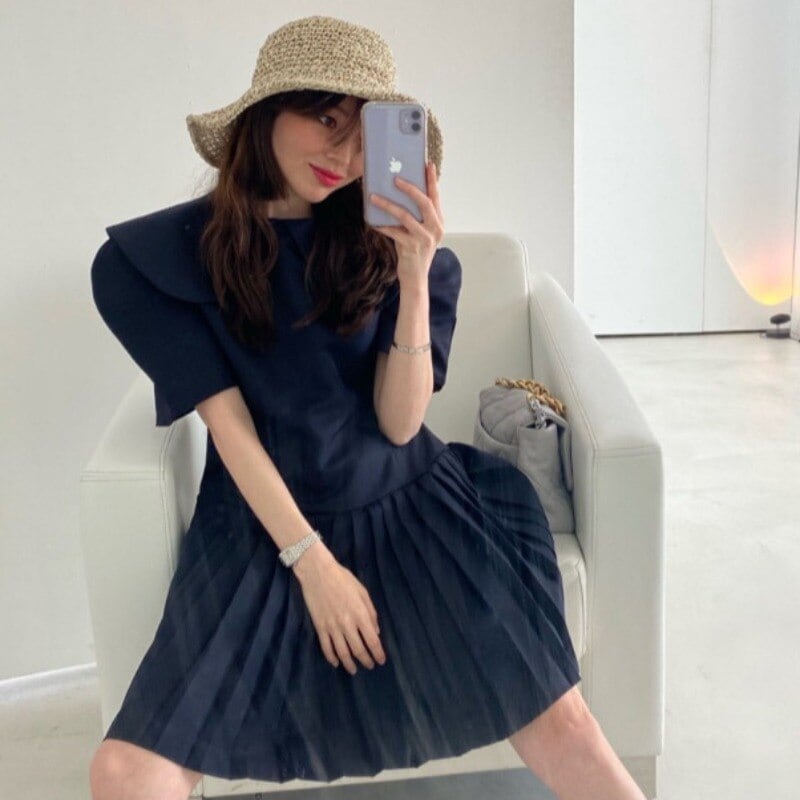 ヴィンテージソリッドプリーツドレス女性サマールーズピュアピーターパンネックミニドレスパフスリーブドレスVestidos 夏物 ソリッドカラー ビンテージ