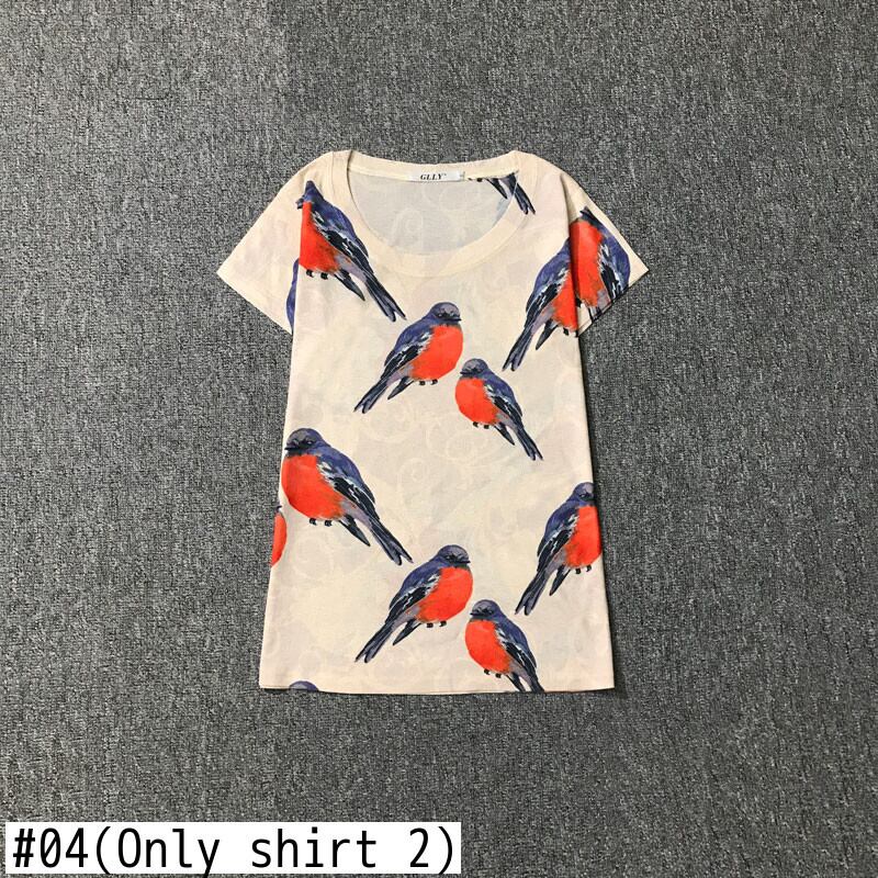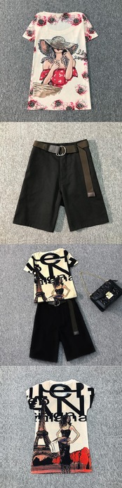 レディースサマー2点セットヴィンテージプリント半袖スリムTシャツ+ショーツパンツスーツ ショート ハーフスリーブ 夏物 ブルマー ビンテージ
