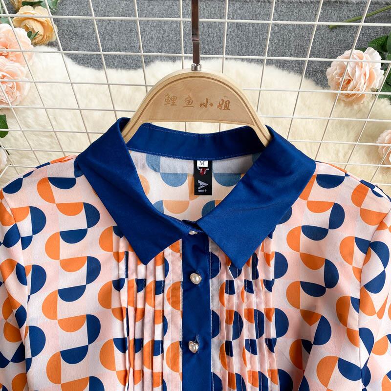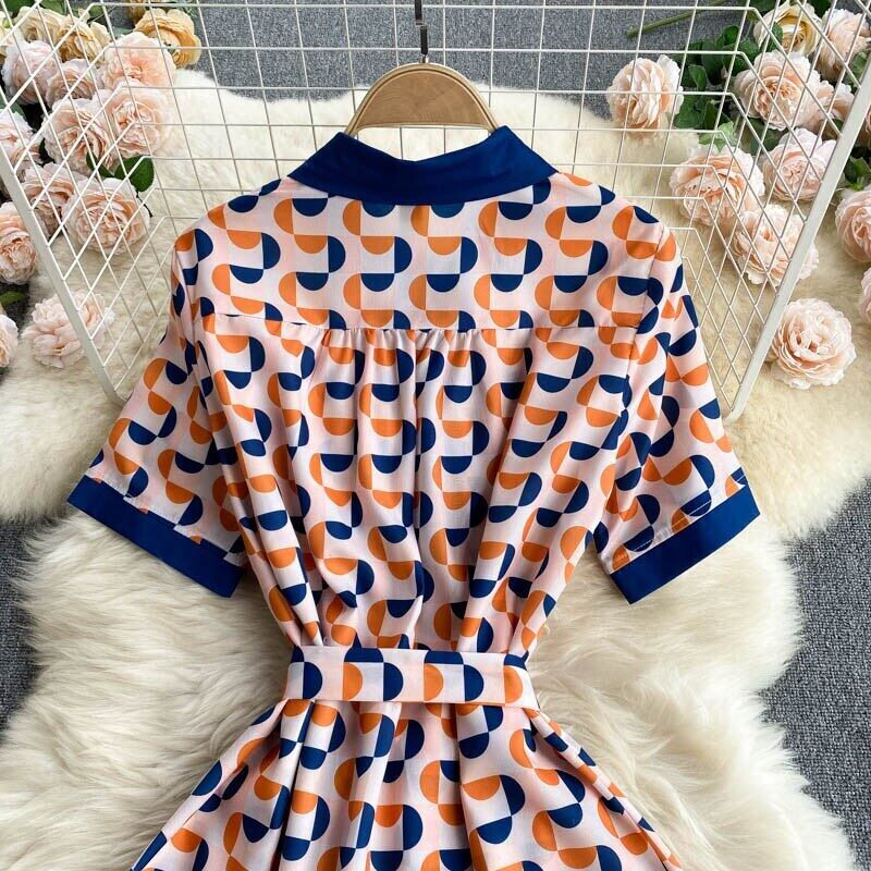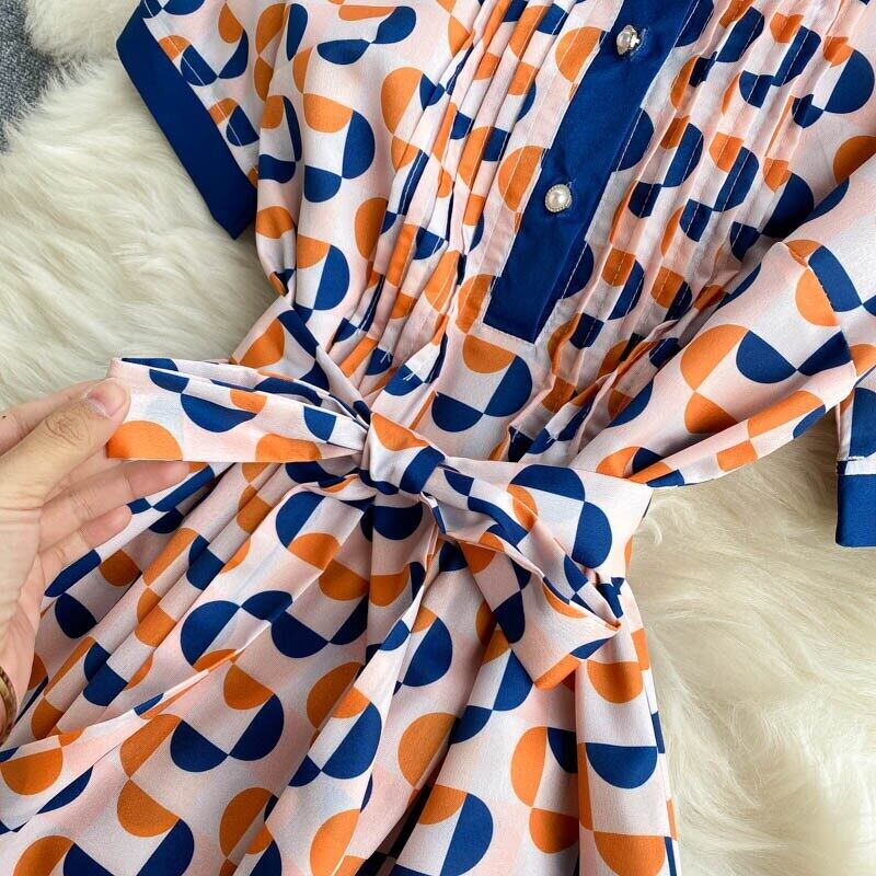 女性レトロプリントドレスターンダウン-襟半袖サッシAラインドレス夏フレンチストリートウェアサンドレス ショート ハーフスリーブ サマー 夏物