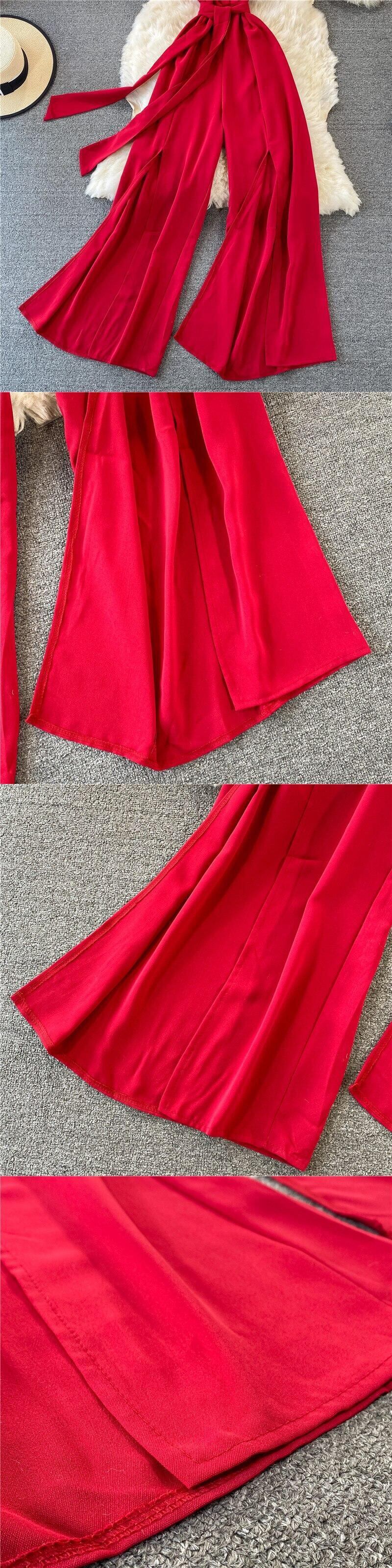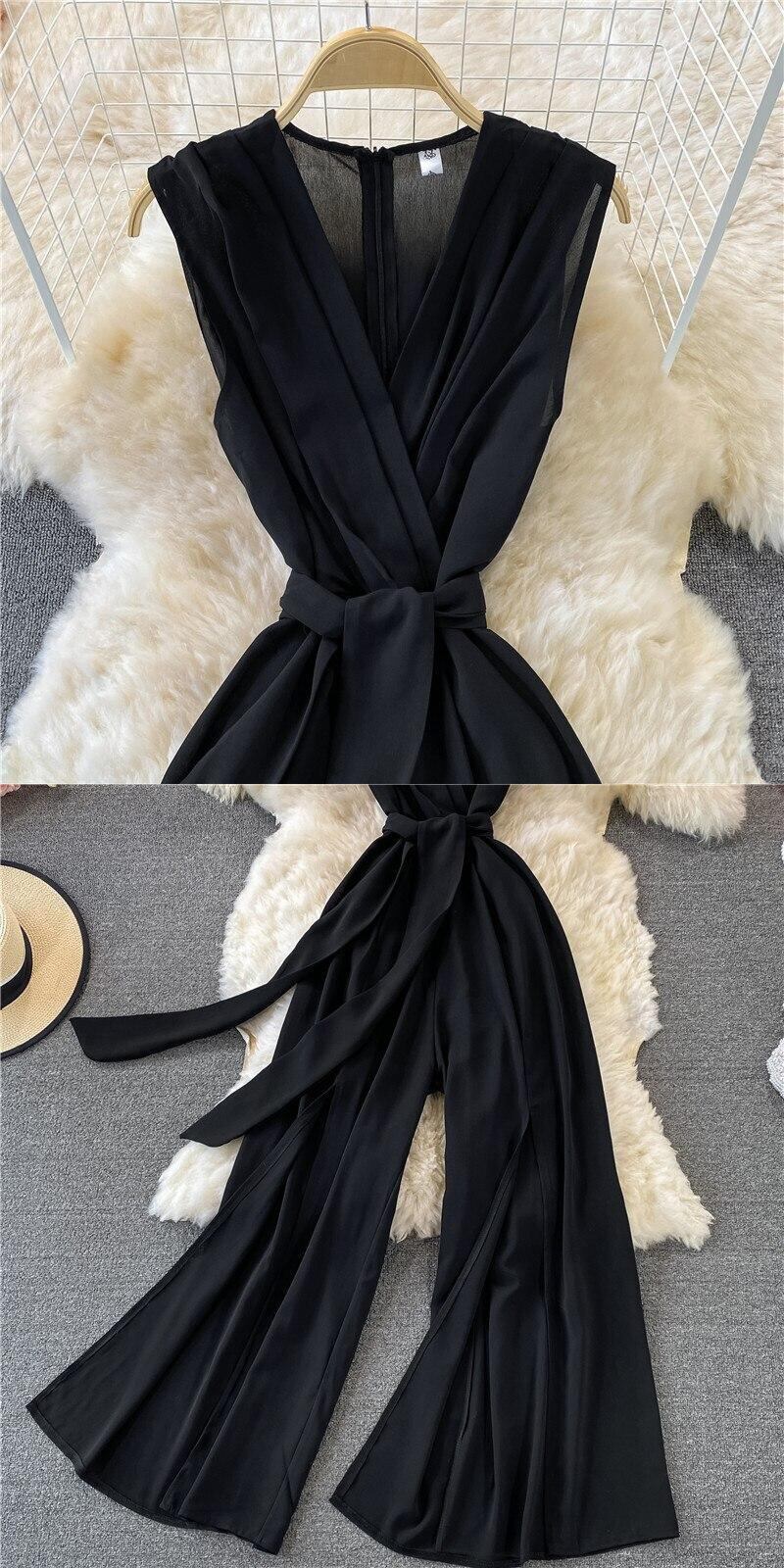 2021年夏のVネックウエストスリムワイドレッグジャンプスーツ女性レースアップサッシュフロントスリットホリデー衣装 サマー 夏物 ワイドパンツ