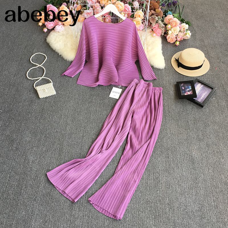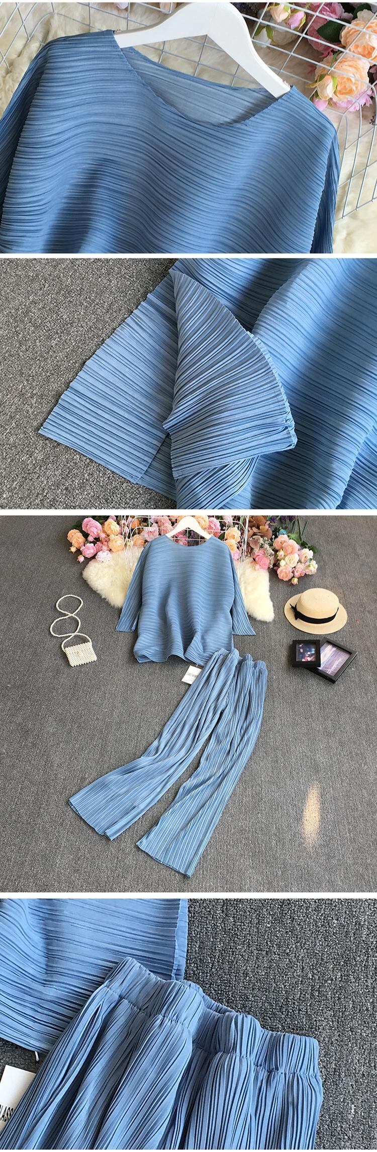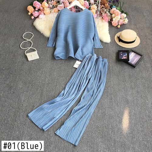 2021年春秋Oネック長袖ショートプリーツトップス+ウエストカジュアルワイドレッグプリーツパンツツーピースセット ロング スプリング 春物 オータム 秋物 ワイドパンツ