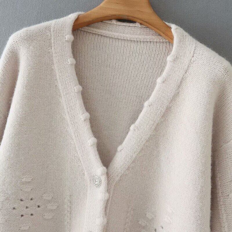 2021年秋気質ソリッドルースカーディガンVネックランタンスリーブジャクラッドホールセーターヴィンテージオールマッチニットトップス ソリッドカラー ビンテージ