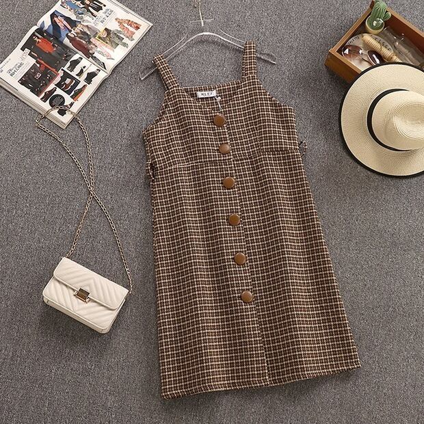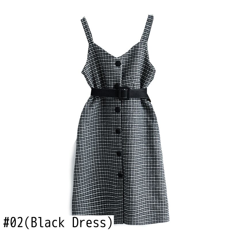 秋冬 女性 長袖 ニット Tシャツ+ツイードブレンドチェック柄ワンピース2点セット ベルト付き ロング オータム 秋物 ウィンター 冬物 ハーネス