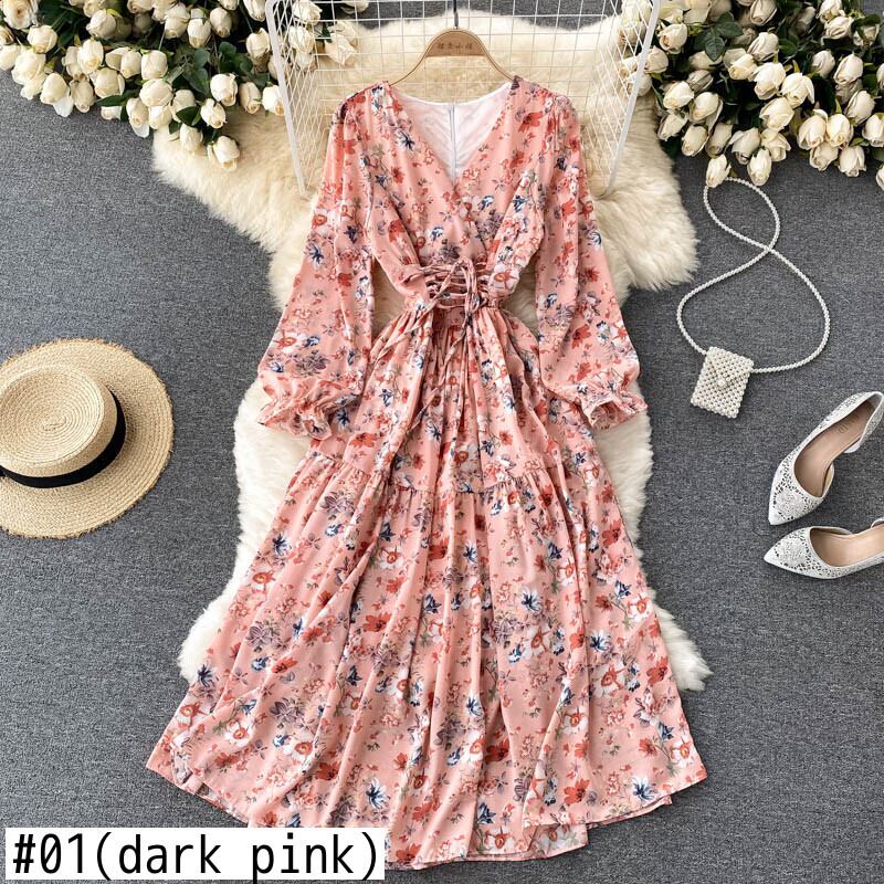 女性シフォンフローラルドレス長袖VネックAラインドレス秋のボヘミアンプリントバケーションミディドレス ロング オータム 秋物 花柄