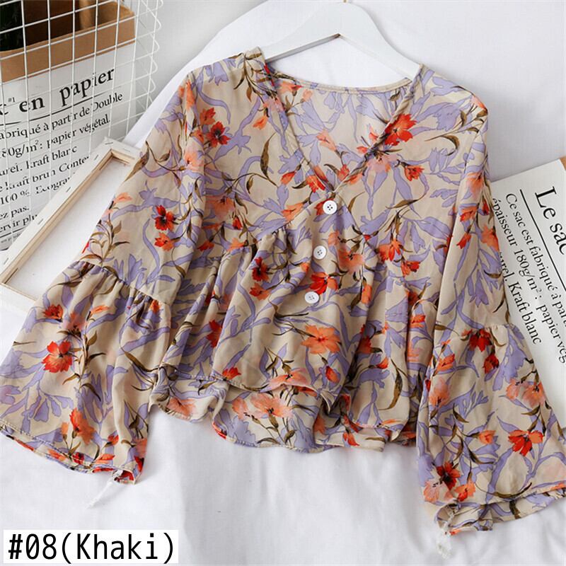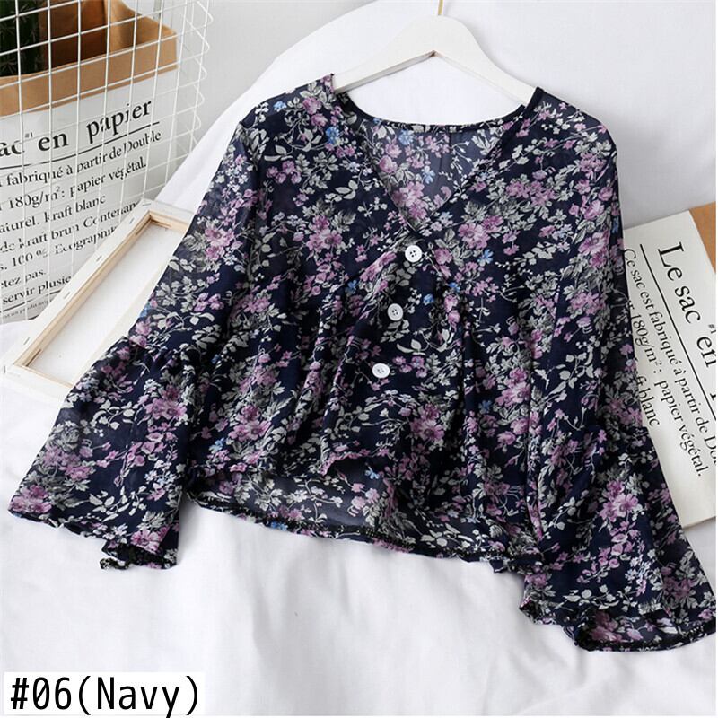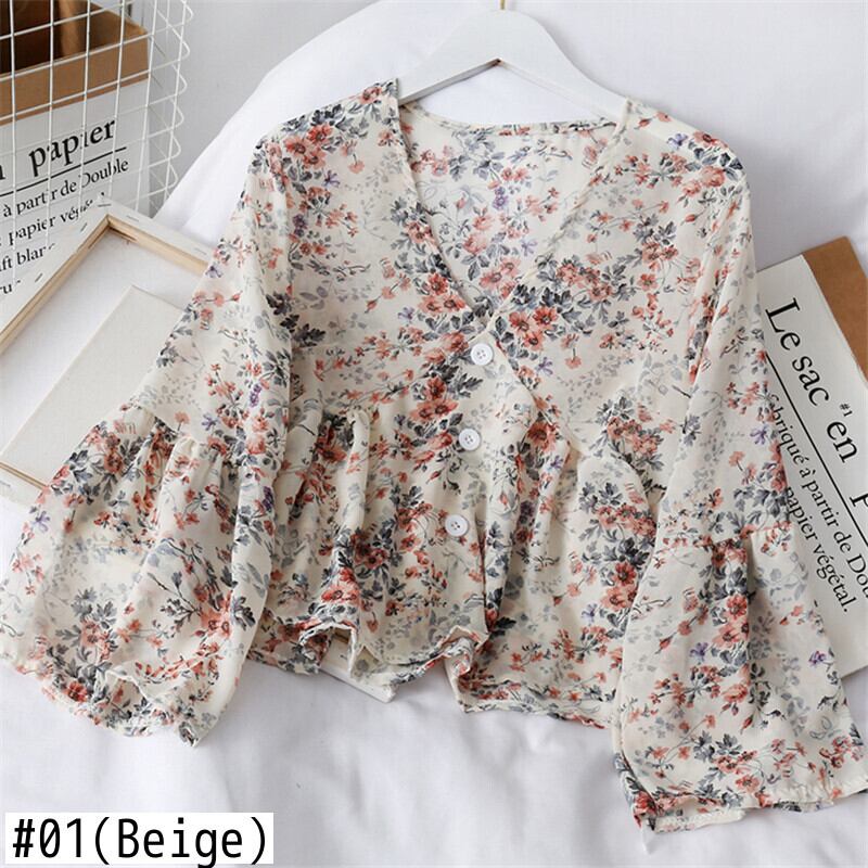 花柄Vネックブラウススウィートショートスタイル女性シフォントップスとブラウス長袖フリルボタンシャツ ロング ラッフル 大人ガーリー キュート カジュアル