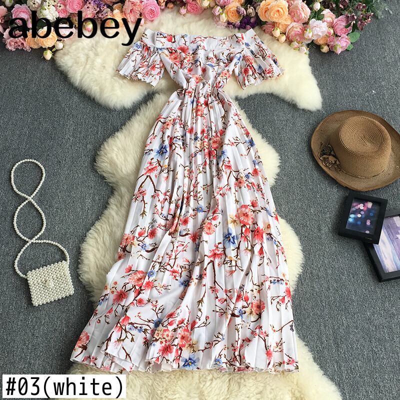2021年夏の女性気質スラッシュネックフレアスリーブドレスハイウエストフローラルプリントミドル丈Aラインプリーツドレス ハイウェスト サマー 夏物 花柄