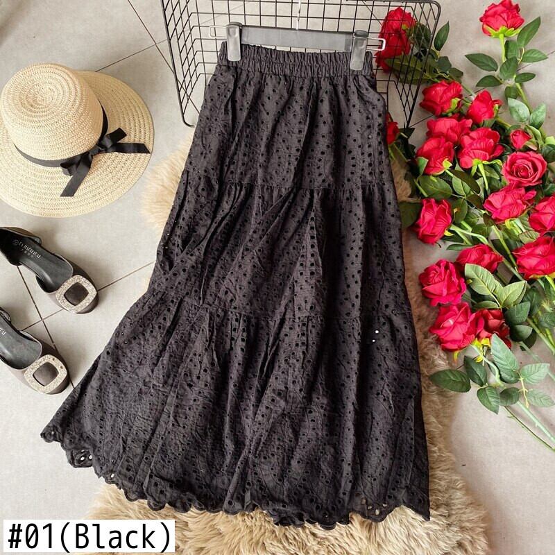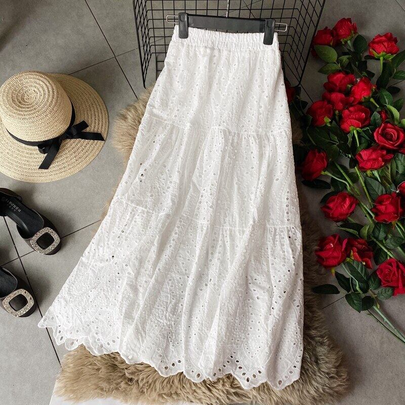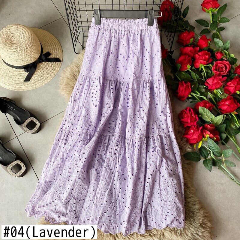 ソリッドホワイト/パープルホローアウトスカートレディースエラスティックウエストAラインヴィンテージミディスカートサイアフラダス 伸縮 ソリッドカラー ビンテージ