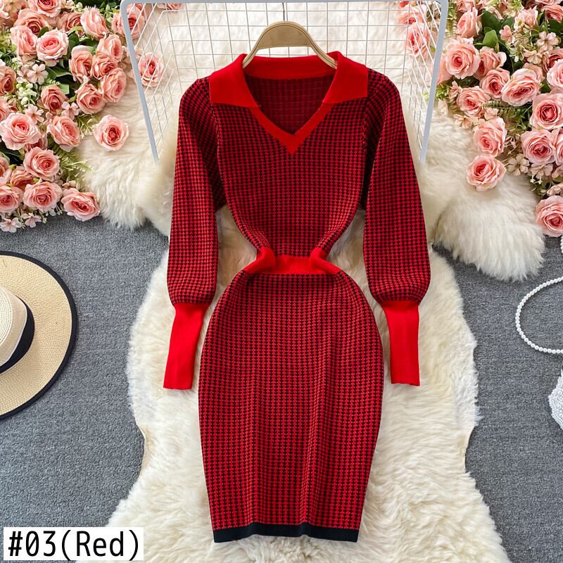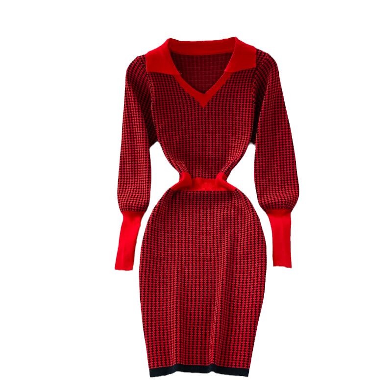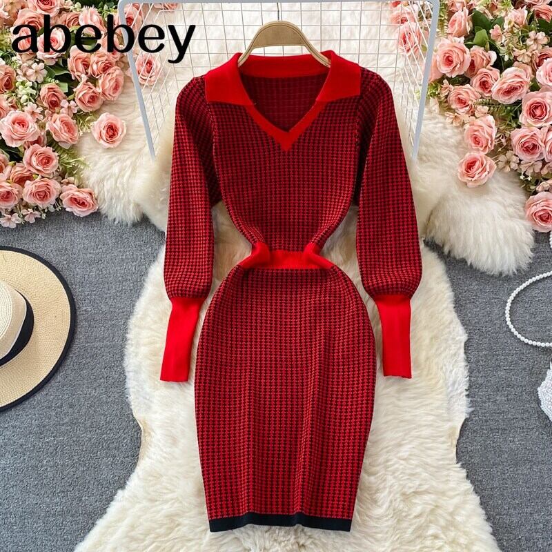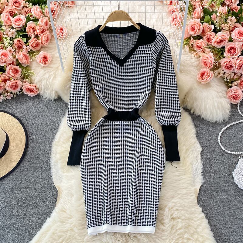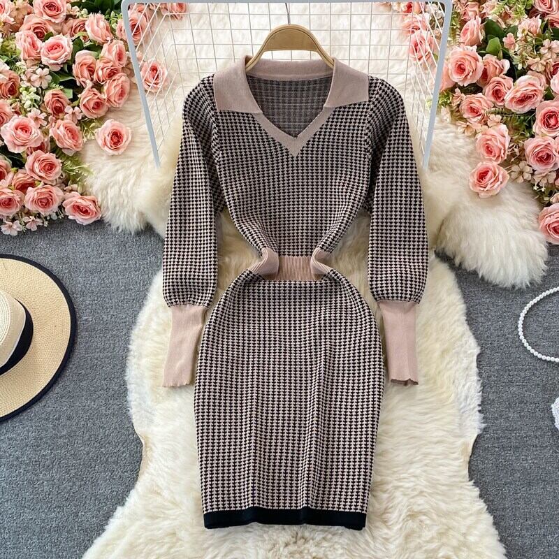 女性レトロチェック柄ニットワンピース長袖Vネック伸縮性スリムシースワンピース秋冬セクシーボディコンセーターワンピース ロング エラスティック オータム 秋物 ウィンター 冬物
