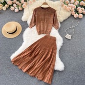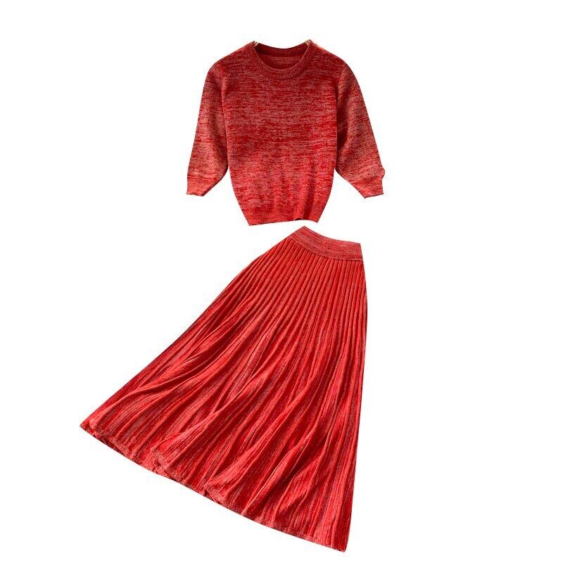 女性秋ニットセット長袖Oネックスリムショートトップス+ウエストAラインプリーツスカートツーピーススーツ ロング オータム 秋物