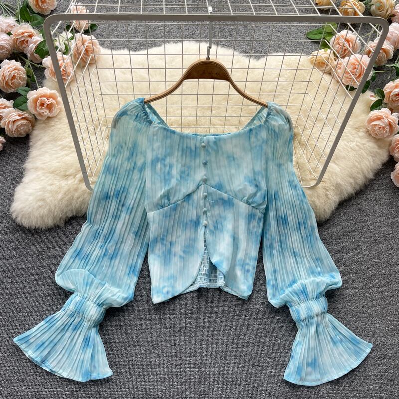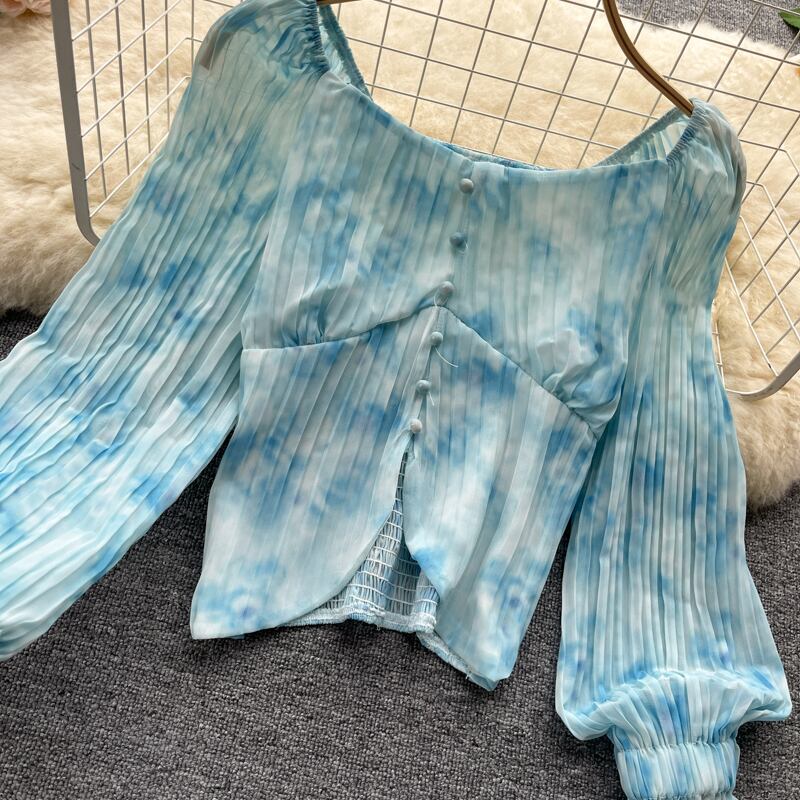 女性タイダイブラウス長袖スクエアカラー伸縮性シャーリングスリムトップス秋のストリートウェアショートブラウス ロング エラスティック オータム 秋物 スクウェア