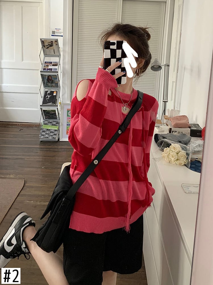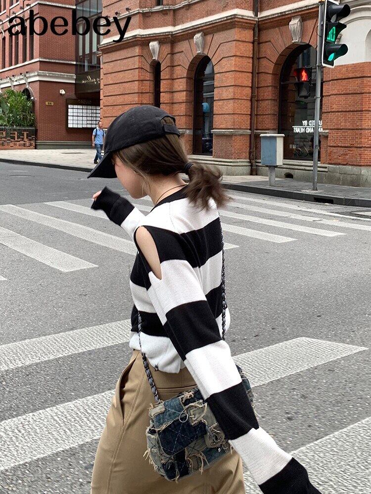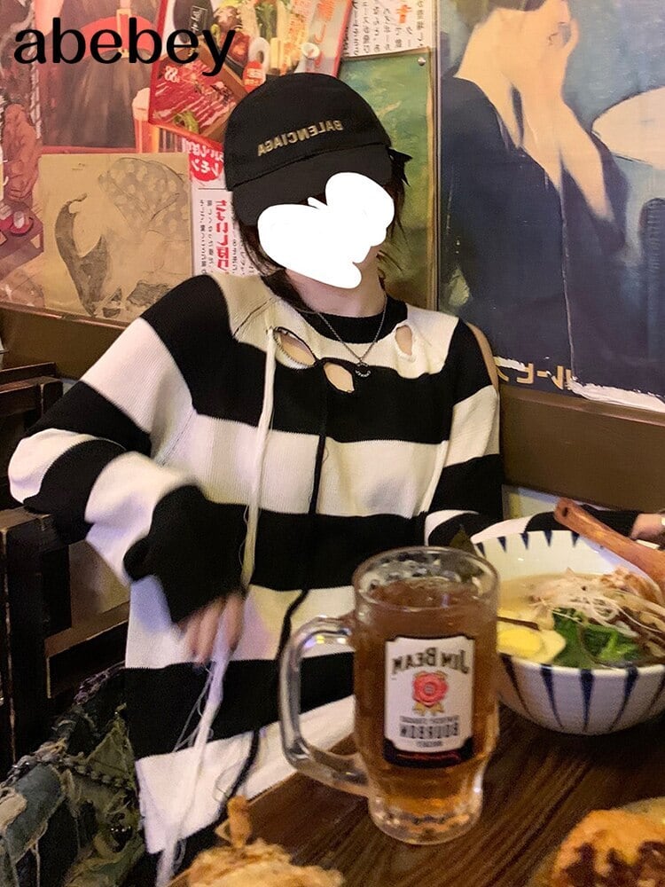 2021ストライププリント特大プルオーバー女性冬Oネックルーズロングセーターストリートウェアアウター ウィンター 冬物