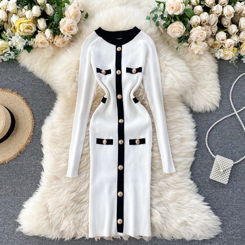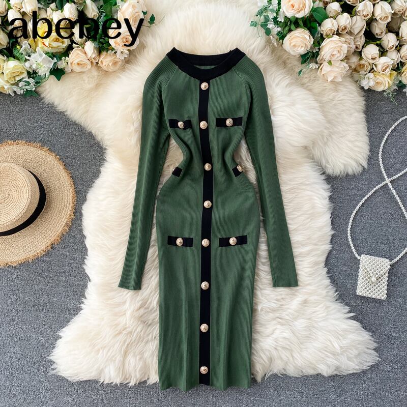 女性ニットシースドレス秋のオフィスボディコンニットドレス冬の伸縮性のあるOネックボタンレトロセータードレス エラスティック オータム 秋物 ウィンター 冬物 会社 学校 通勤や通学にも