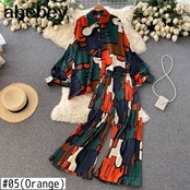 女性サマーレトロプリントセットバットウィングスリーブシングルブレストブラウス+ウエストロングパンツツーピーススーツ 夏物