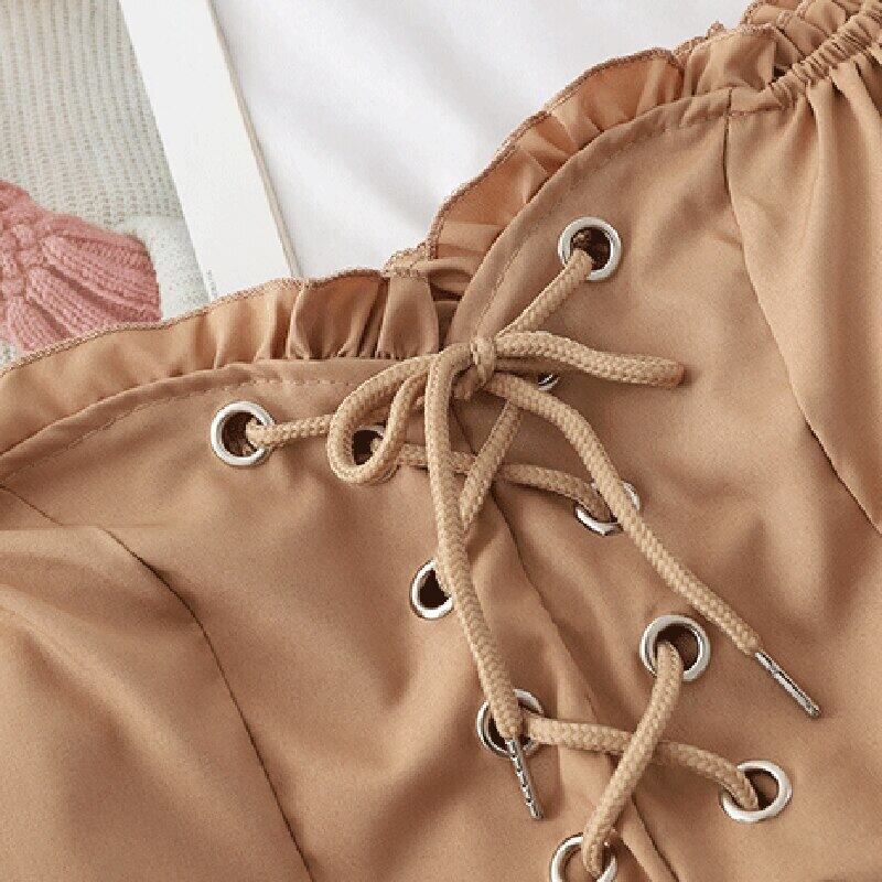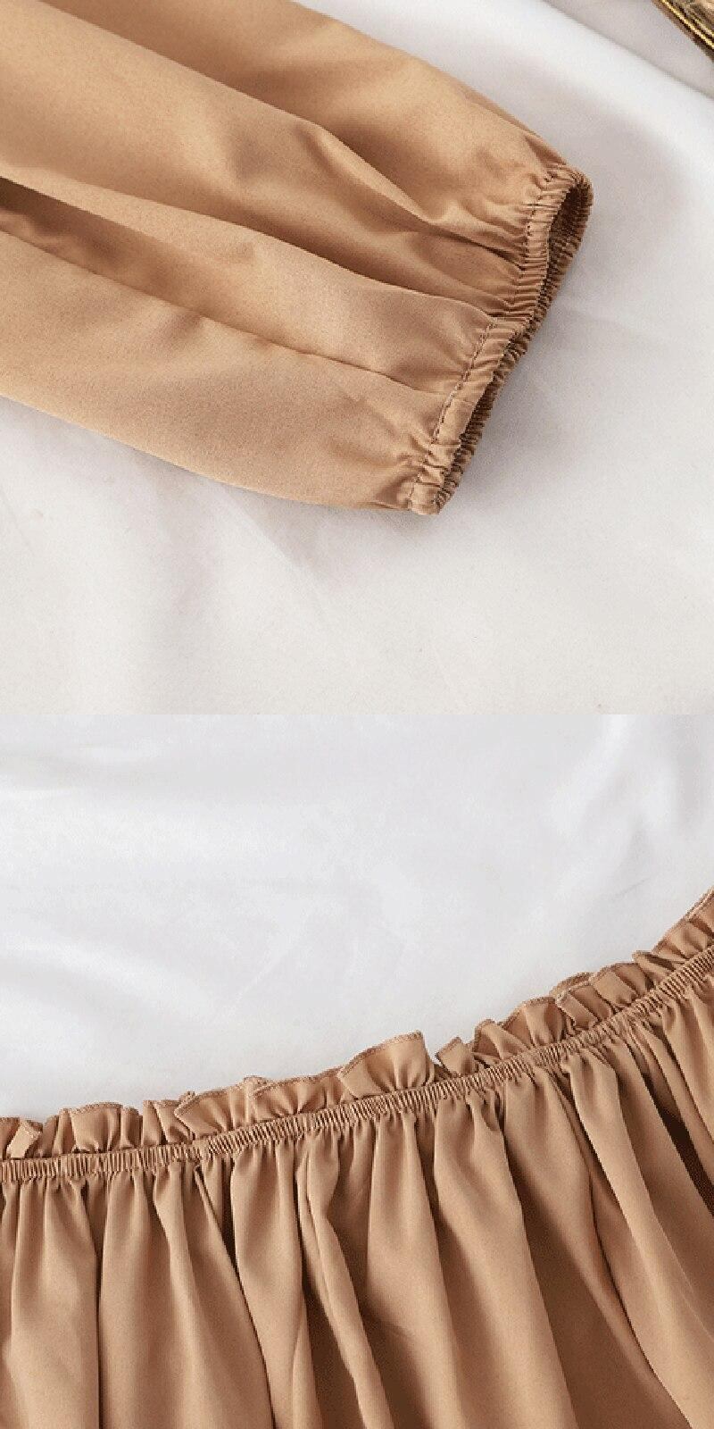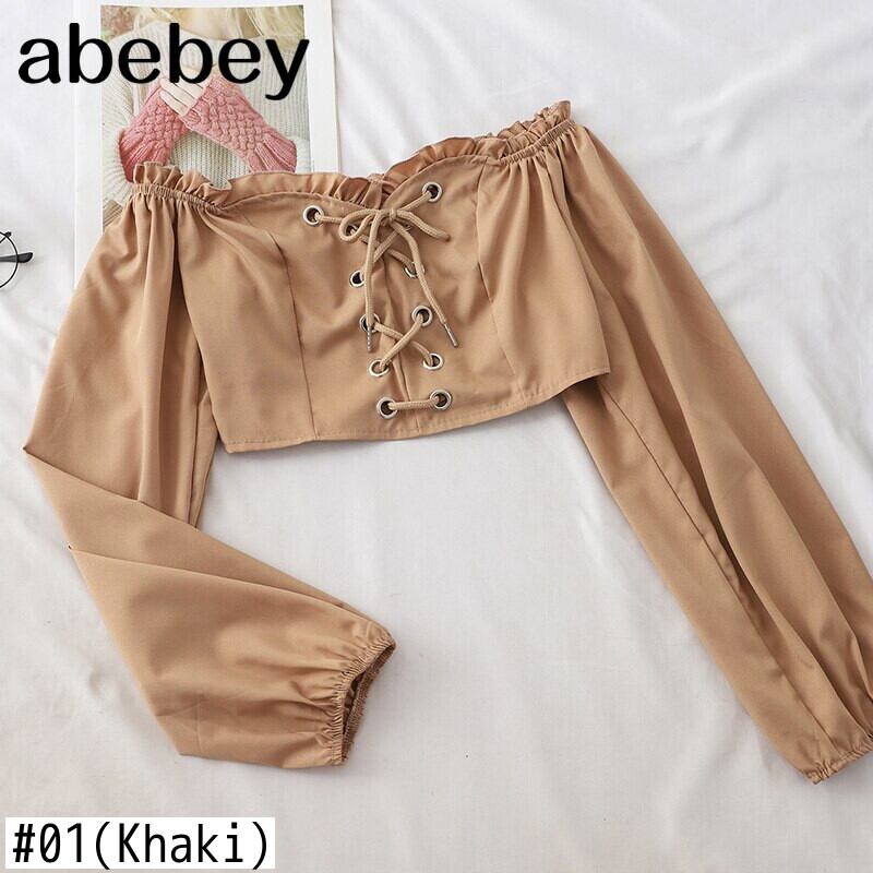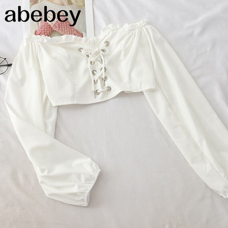 ブラウス女性フリルスラッシュネックストラップレスロングパフスリーブシャツレースアップスーパーショートトップス2021サマーブラックホワイト ラッフル 夏物