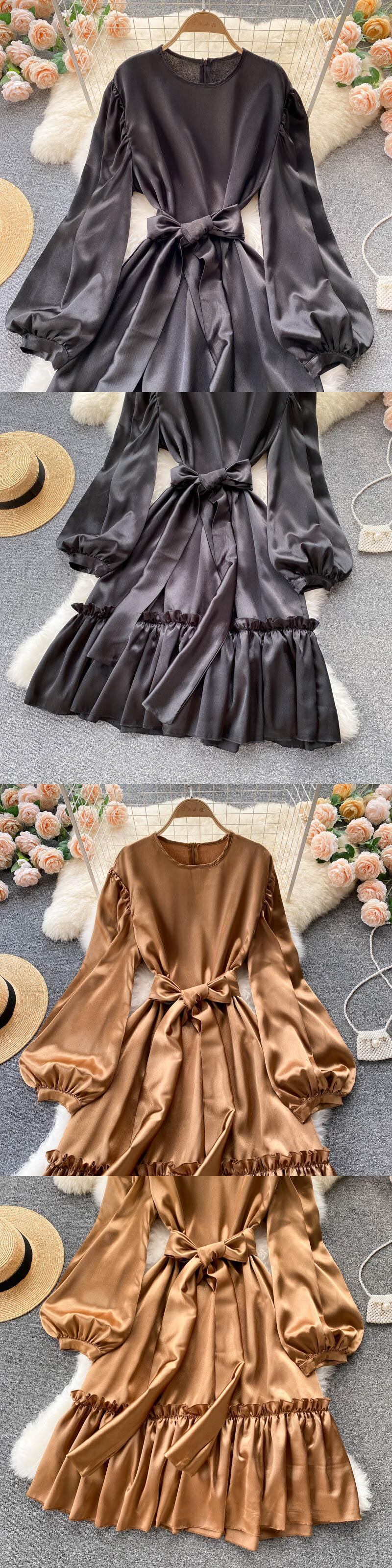 女性フレンチサテンドレスパフスリーブOネックサッシAラインドレス秋のストリートウェアフリルミディドレス ラッフル オータム 秋物