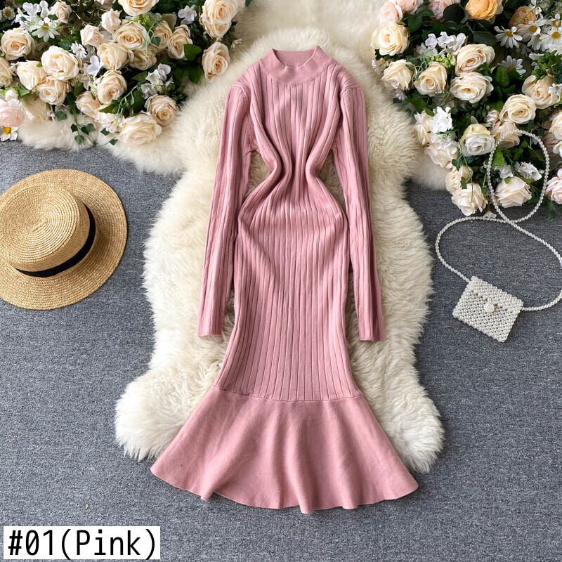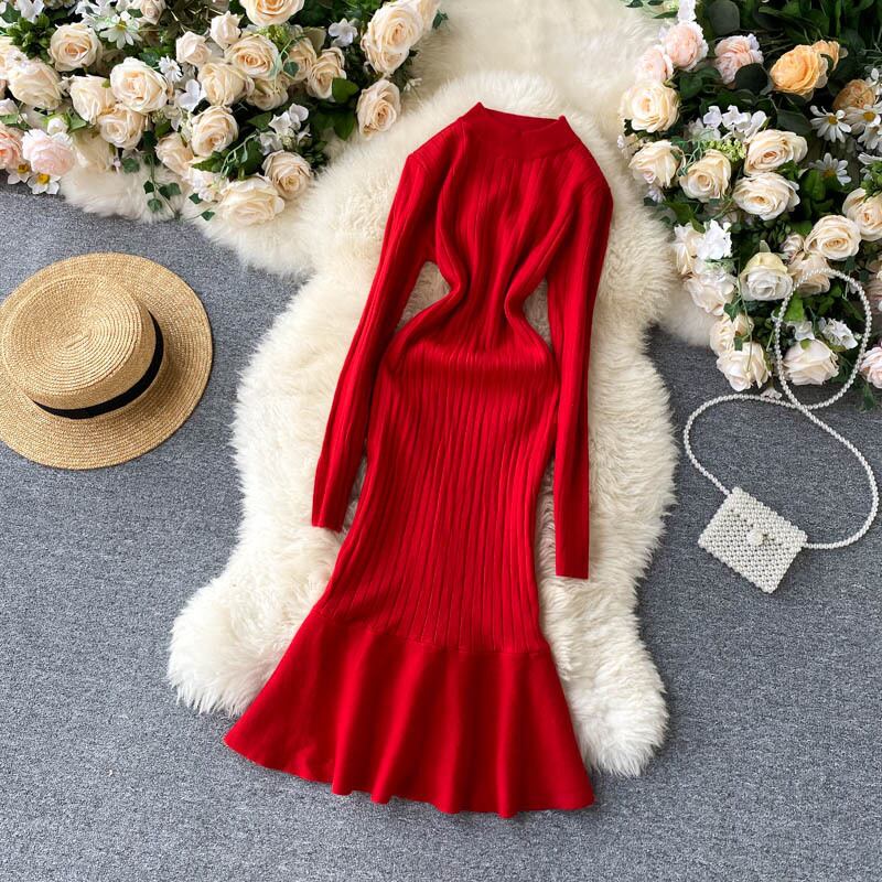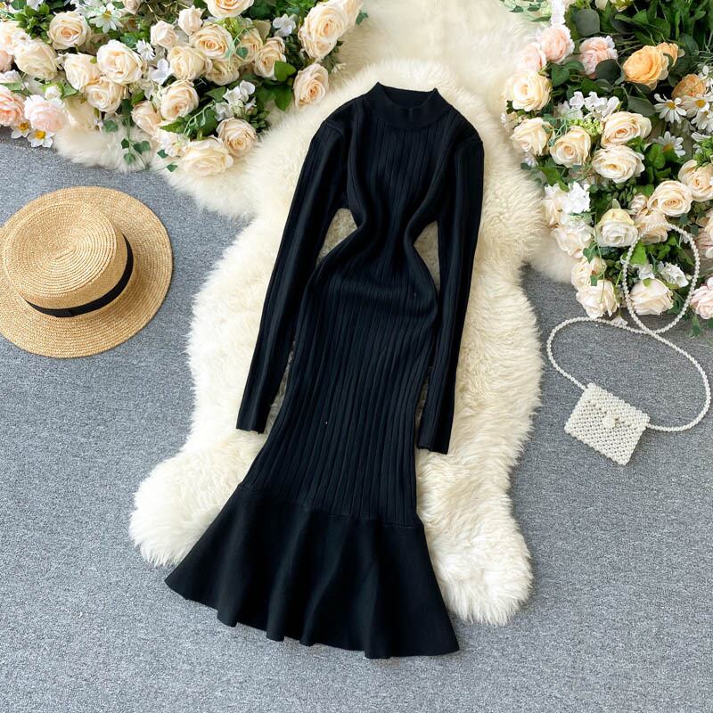 ニット フィッシュテールドレス 女性 暖かい 長袖 Aライン 秋冬 ボディコンセータードレス ロング エラスティック 伸縮 オータム 秋物 ウィンター 冬物