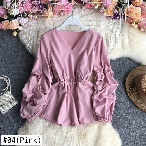 2021年春秋気質万能Vネック長袖シャツハイウエストプリーツウエスト無地ショートシャツトップス ハイウェスト ロング スプリング 春物 オータム 秋物 ソリッドカラー