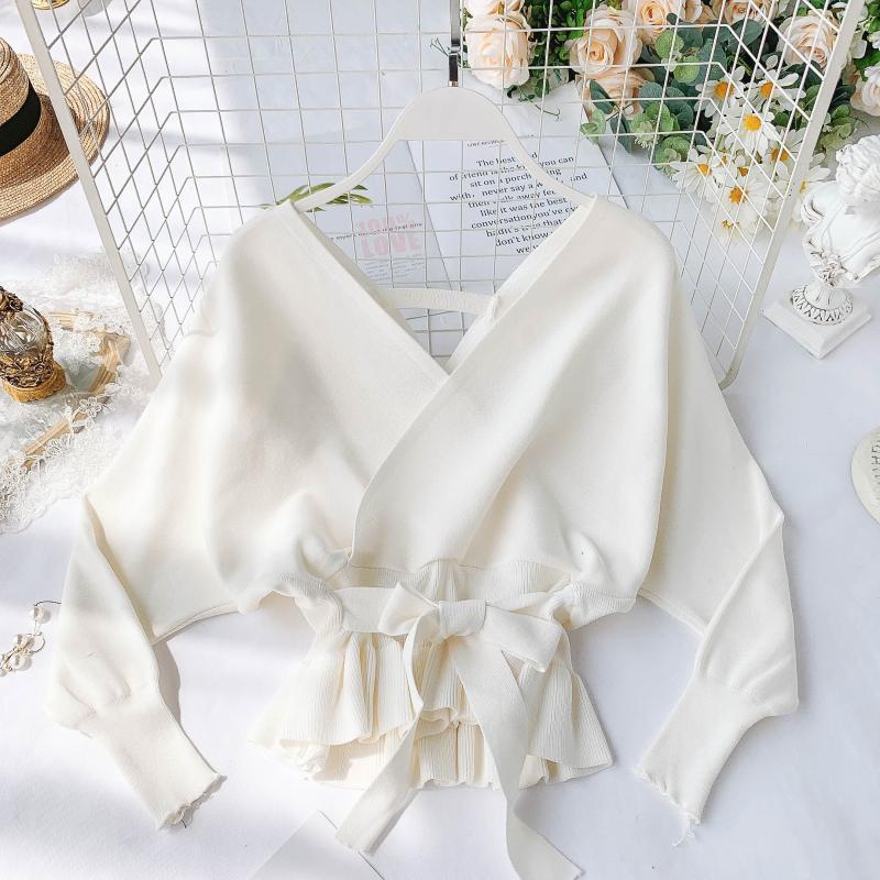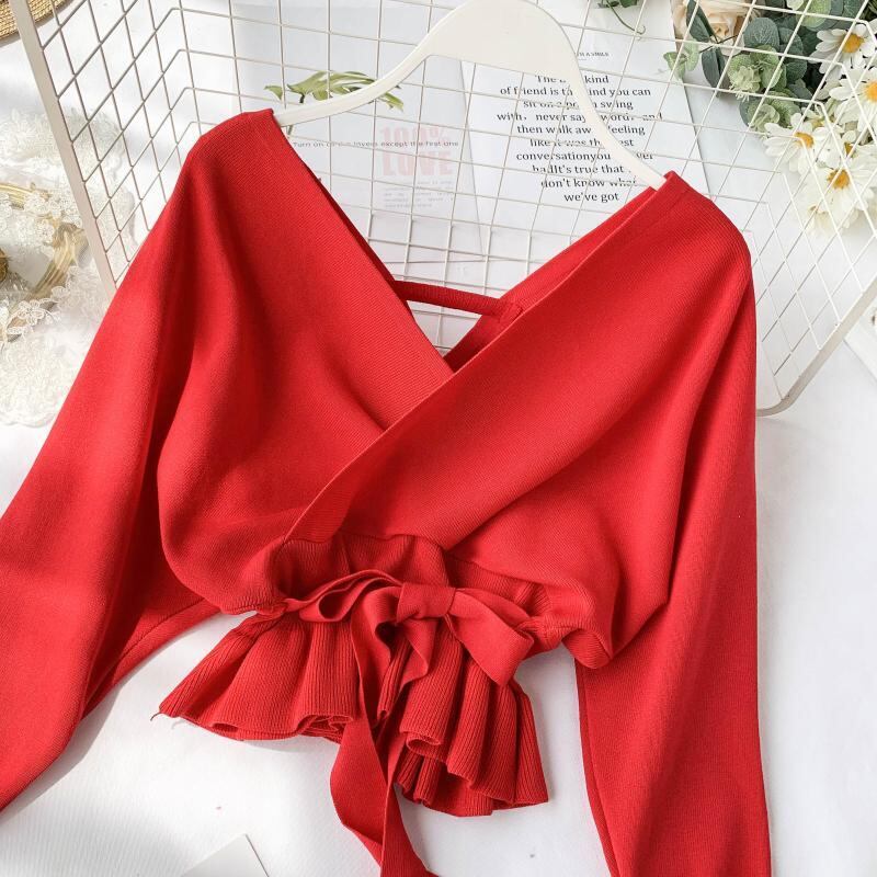 レースアップVネック冬服ニットセーター女性バット長袖スリムウエストプルオーバーセクシーフリルショートトップスジャンパー ロング ウィンター 冬物