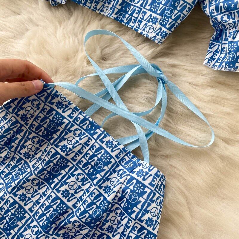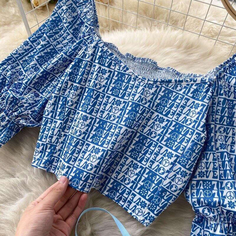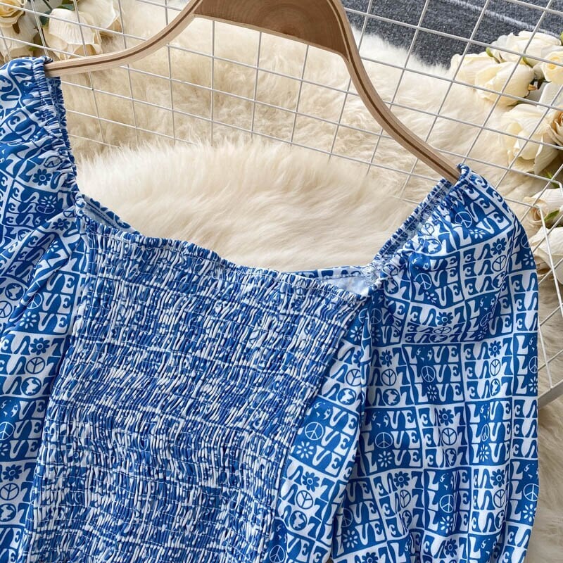 女性サマープリントセット伸縮性シャーリングパフスリーブVネックショートトップス+ウエストスプリットロングスカートツーピーススーツ エラスティック 夏物