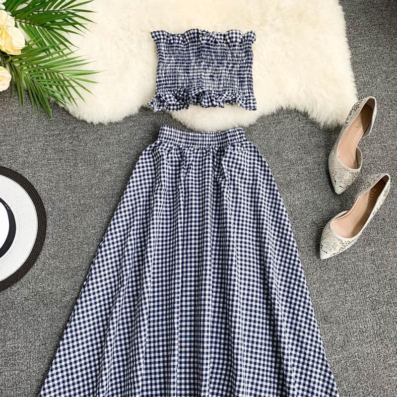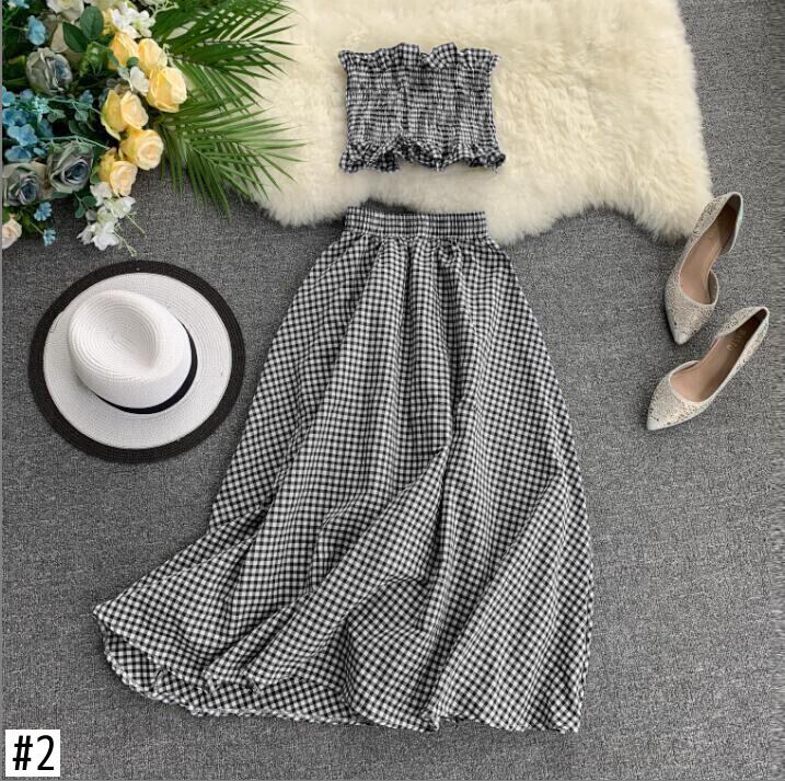 新しい夏のツーピースの服の女性のノースリーブタンクトップ+-ウエストスリムロングスカートチェック柄2個セット女性のスーツ サマー 夏物