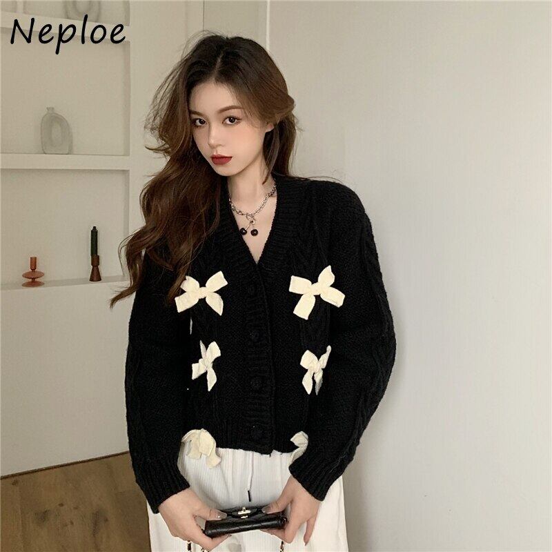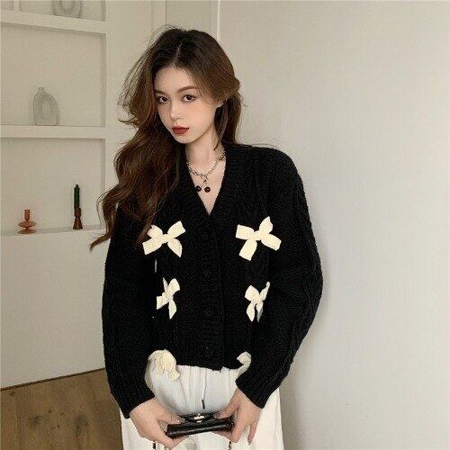 Vネック長袖シングルブレストニットスウェットカーディガンレディースボウシックウォームアウトウェアプルコート春 ロング リボン スプリング 春物