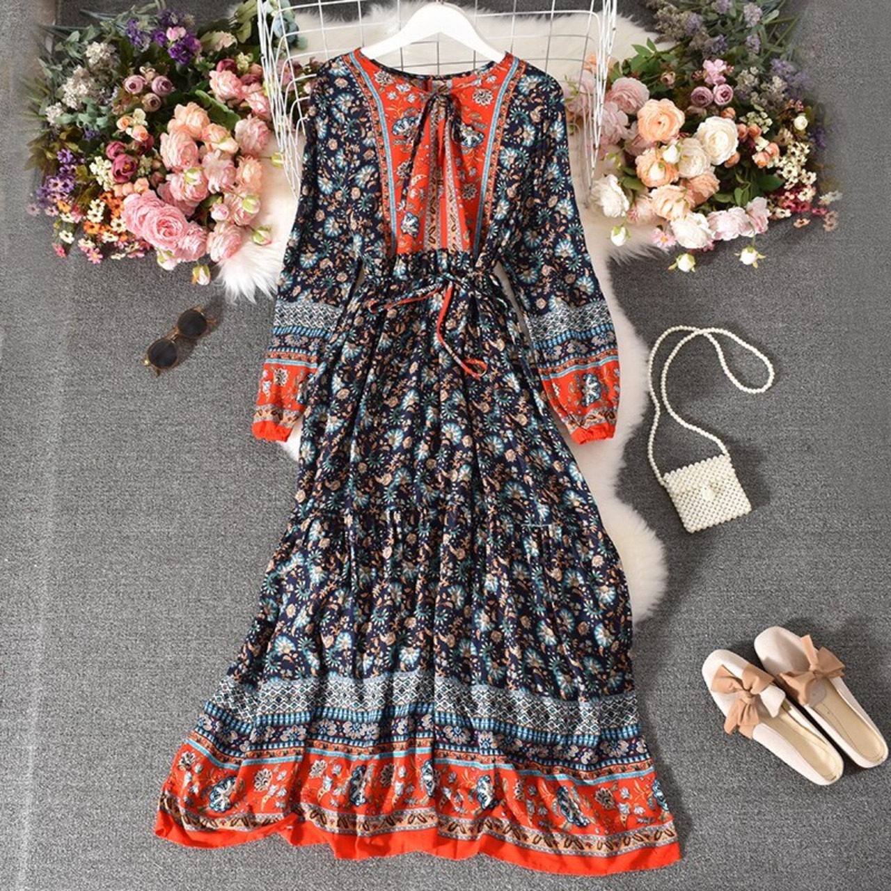 2021年春秋ヴィンテージナショナルスタイルOネック長袖ドレス蝶ネクタイハイウエストレースアッププリントロングAラインドレス ハイウェスト リボン スプリング 春物 オータム 秋物 ビンテージ
