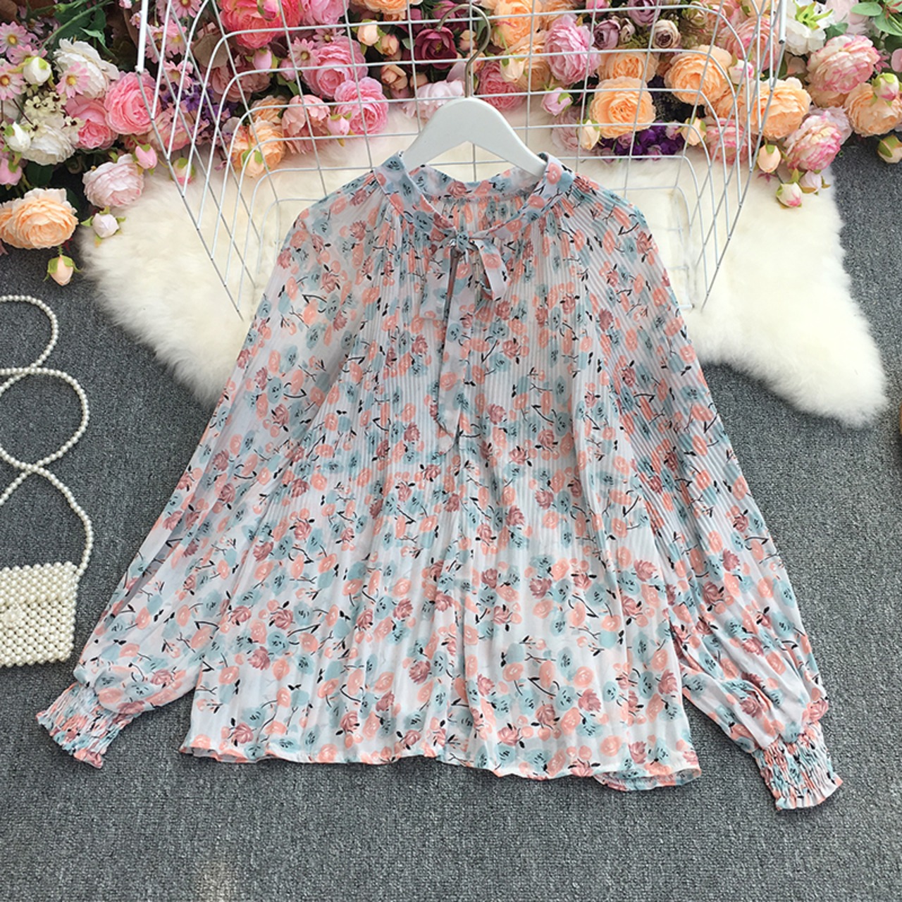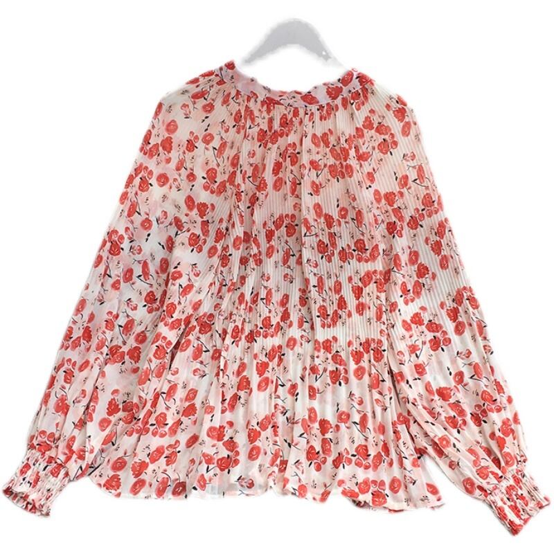 2021年春秋ヴィンテージスタンドカラーランタンスリーブシャツボウ包帯フローラルプリントルーズレジャープリーツシャツトップ リボン スプリング 春物 オータム 秋物 花柄 ビンテージ