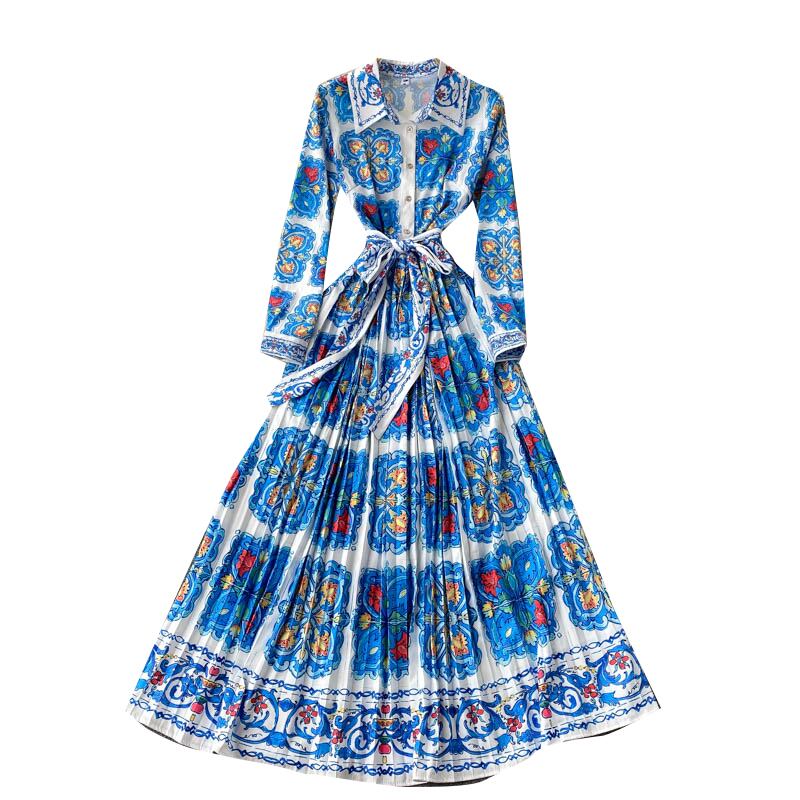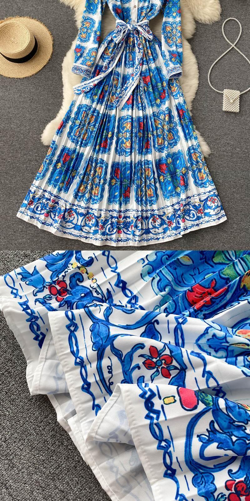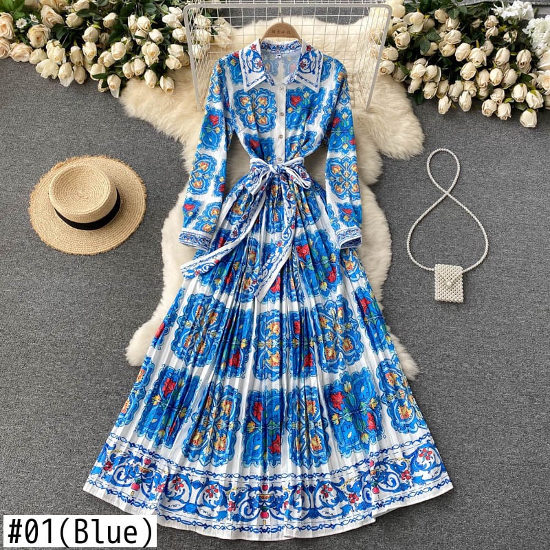 女性レトロプリントマキシドレス長袖ターンダウン-襟Aラインプリーツドレス秋の自由奔放に生きる休暇ロングドレス オータム 秋物
