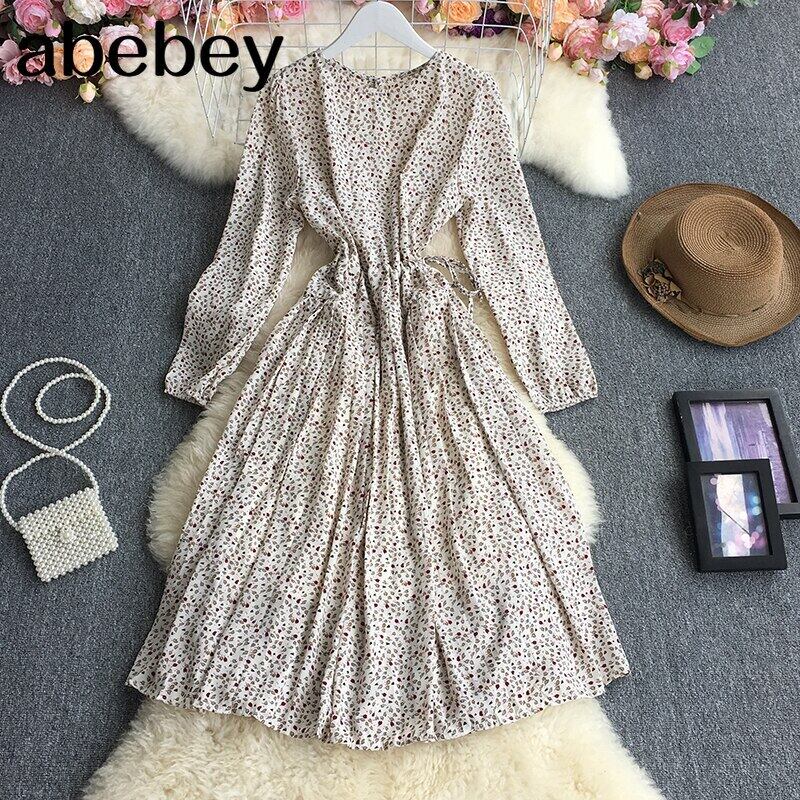 2021年春秋フレンチOネック長袖ワンピースハイウエストレースアップウエストフローラルプリントミドル丈Aラインプリーツワンピース ハイウェスト ロング スプリング 春物 オータム 秋物 花柄