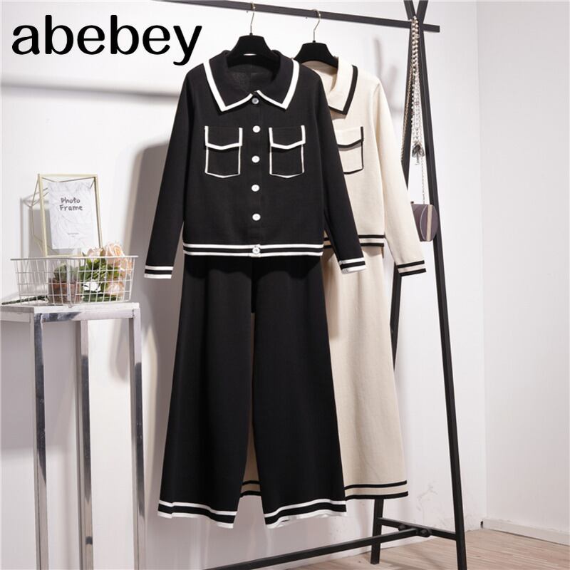 春秋長袖ニットセットレディースヒットカラーターンダウンカラーポケットセータートップとワイドレッグパンツツーピースセット ロング スプリング 春物 オータム 秋物 ワイドパンツ