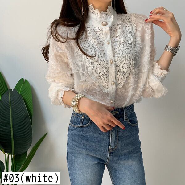 かぎ針編みレースブラウス女性無地スタンドカラー長袖ブラウスヴィンテージブラウス春シャツトップス ロング スプリング 春物 ソリッドカラー ビンテージ