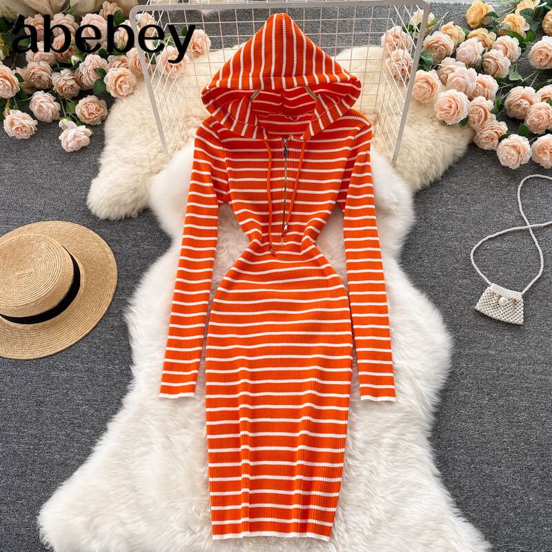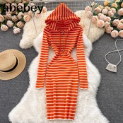 レトロストライプフード付きニットドレス女性長袖スリムシースドレス秋のボディコンセータードレス ロング オータム 秋物