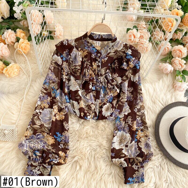 女性レトロプリントブラウスフレンチスウィートフリルパフスリーブルーズトップス秋のボヘミアンプリントストリートウェアブラウス ラッフル 大人ガーリー キュート カジュアル オータム 秋物