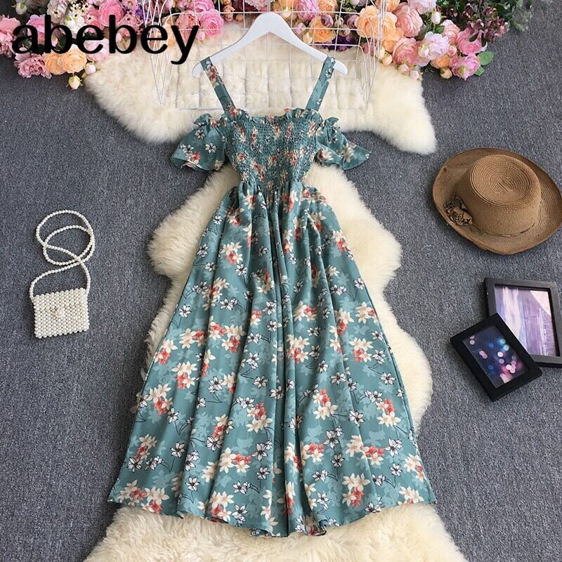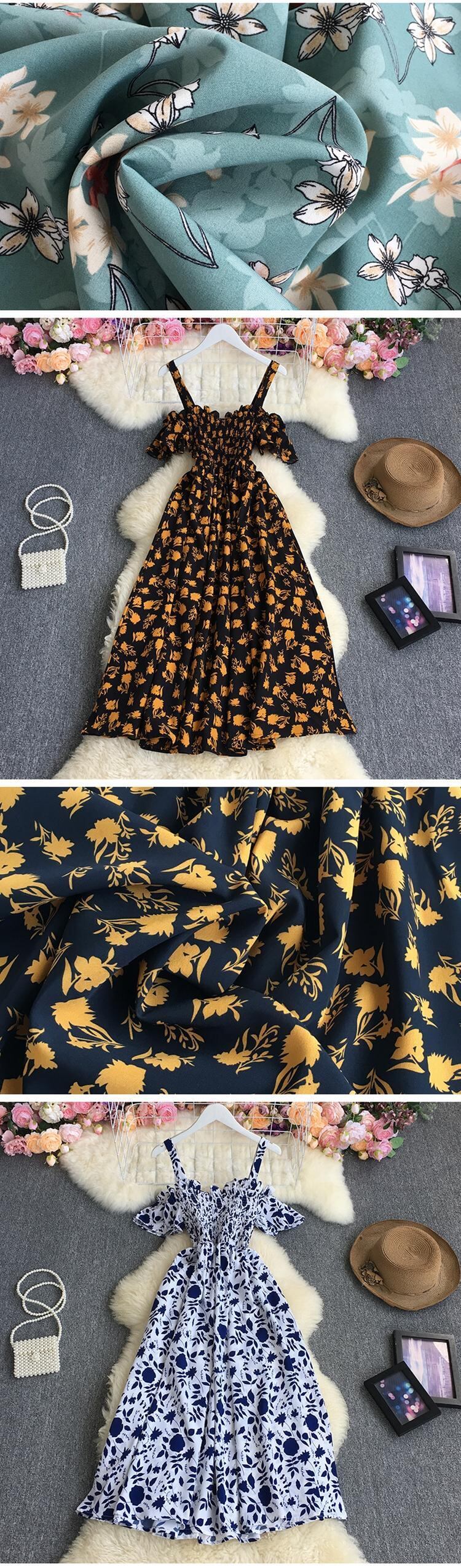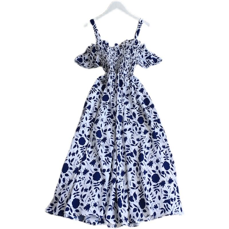 2021年夏のスラッシュネック半袖オフショルダードレスハイウエストプリーツプリントミッドロングAラインストラップドレス ハイウェスト ショート ハーフスリーブ サマー 夏物