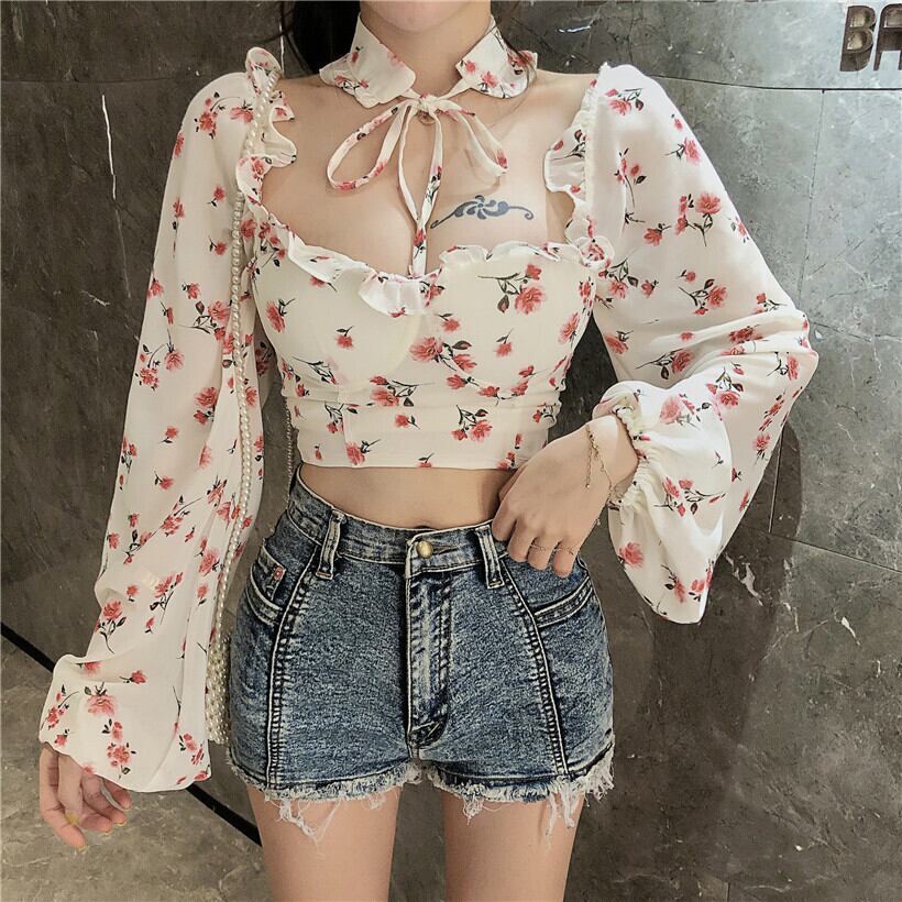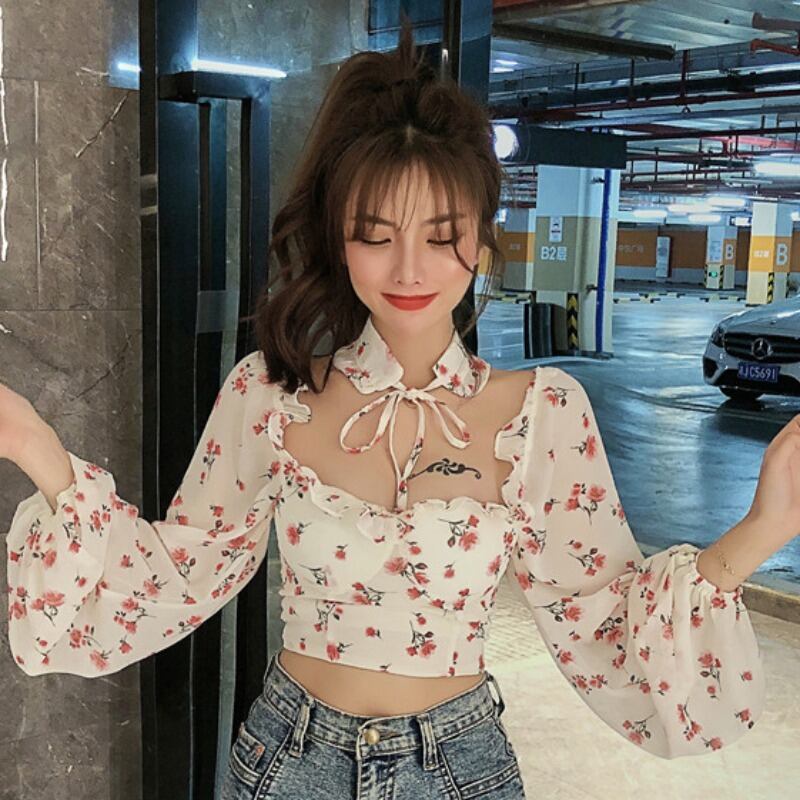 2021年夏の女性シフォンブラウスヴィンテージプリントスクエアカラー長袖シャツビーチスタイルクロップ ロング サマー 夏物 スクウェア ビンテージ