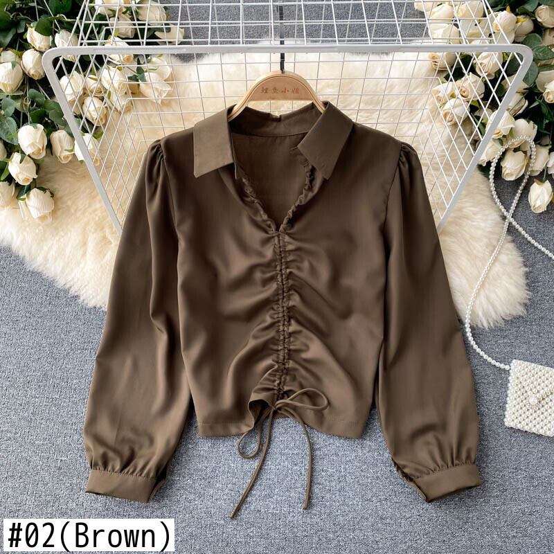 女性フレンチブラウス長袖ターンダウン-襟ドローストリングスリムトップス秋のストリートウェアショートブラウス ロング オータム 秋物