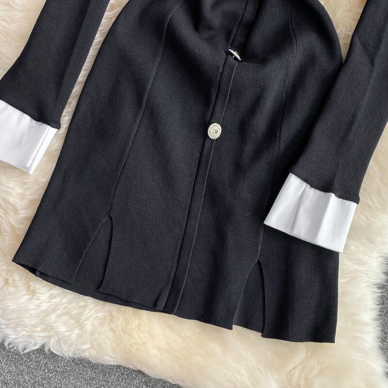 フレンチニットドレスレディースボウVネック長袖伸縮性ペンシルドレス秋冬セクシースプリットセータードレス ロング リボン エラスティック オータム 秋物 ウィンター 冬物