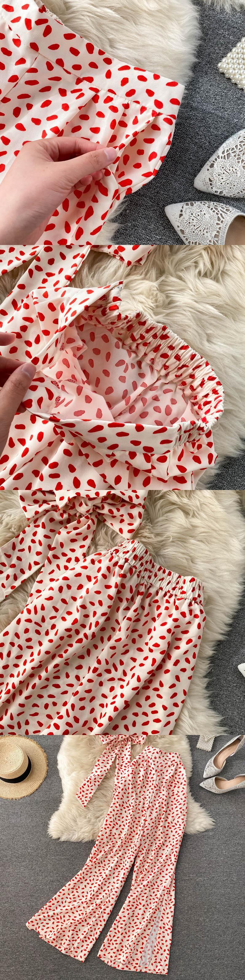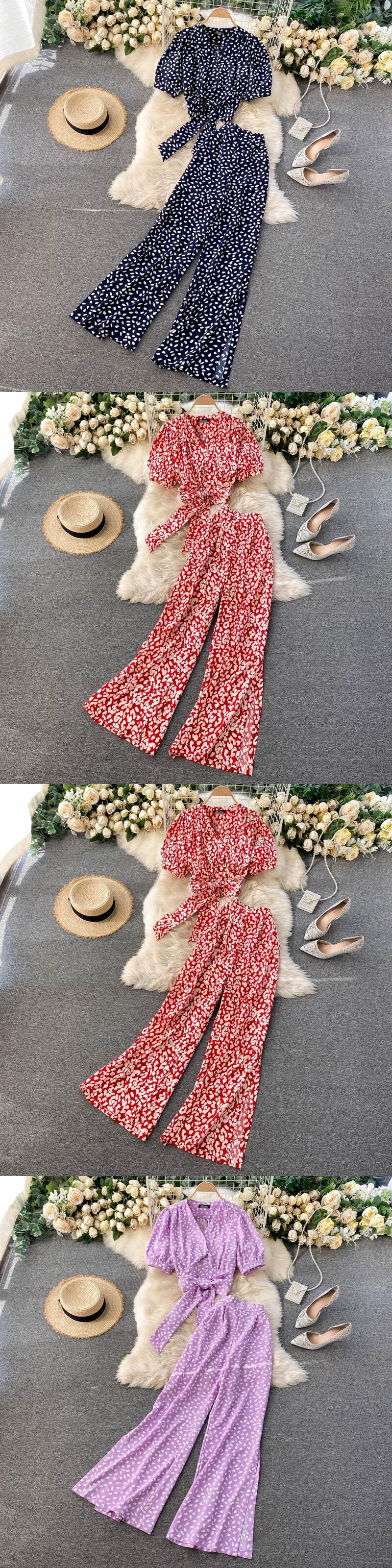 女性サマーボホフローラルホリデーセットVネックパフスリーブショートトップス+ウエストセクシースプリットワイドレッグパンツツーピースセット 夏物 花柄 ワイドパンツ
