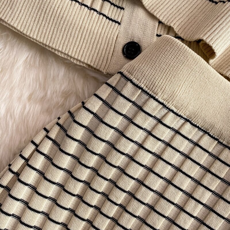 SINGREIN Women Autumn Winter Stripe Knitted Set Turndown-Collar Top + Sexy Off Shoulder Tank Top + Slim Skirt Three Piece Set オータム 秋物 ウィンター 冬物 スカート ストライプ オフショルダー