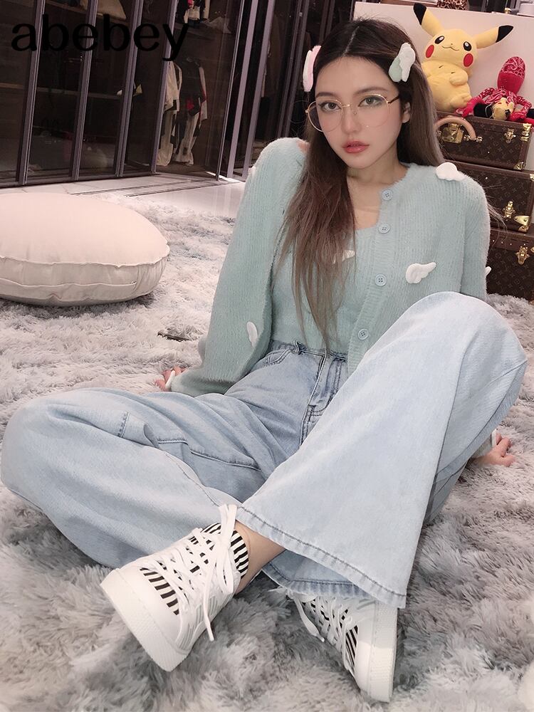 2021年春の新作レディース刺繡ブルークロップドニットカーディガン2点セットファッションストリートウェアセクシーな女性クロップトップ 刺繍 スプリング 春物