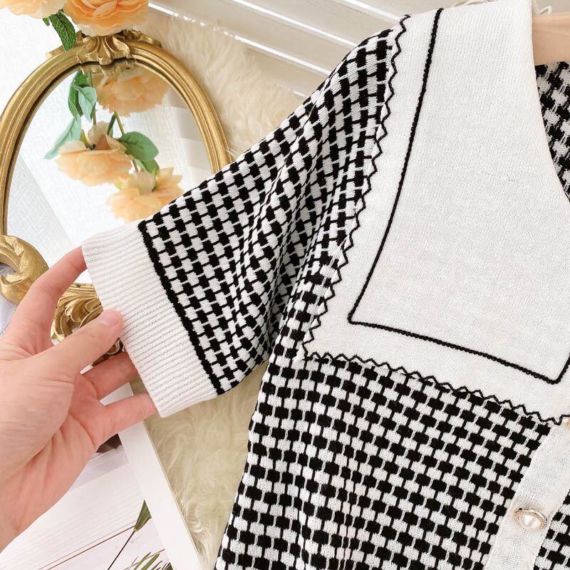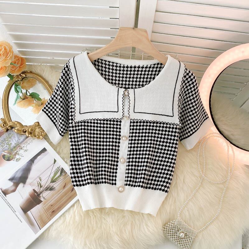 レトロチェック柄ニットブラウス女性ターンダウン-襟半袖スリムトップスサマーストリートウェアショートブラウス ハーフスリーブ 夏物