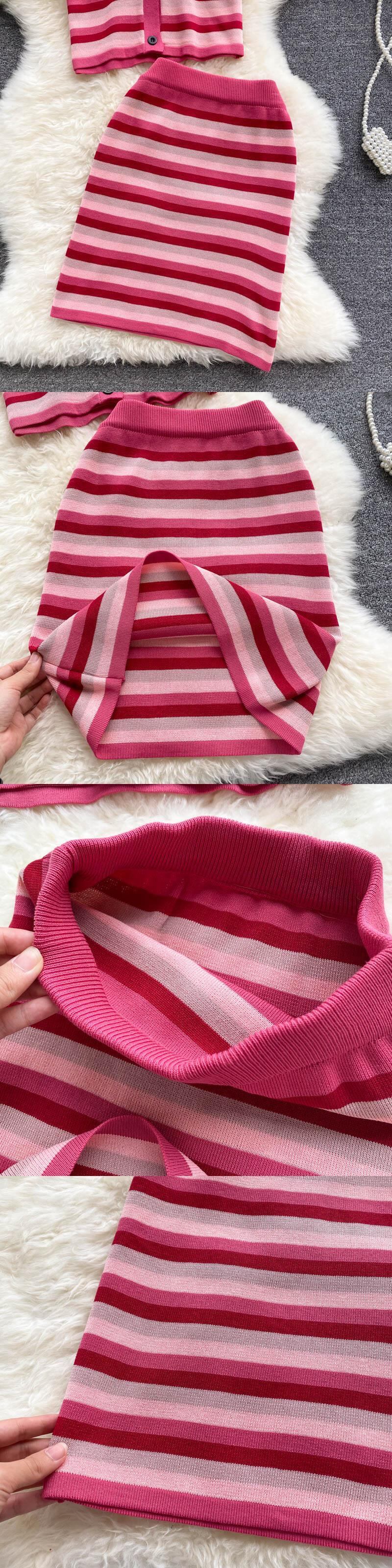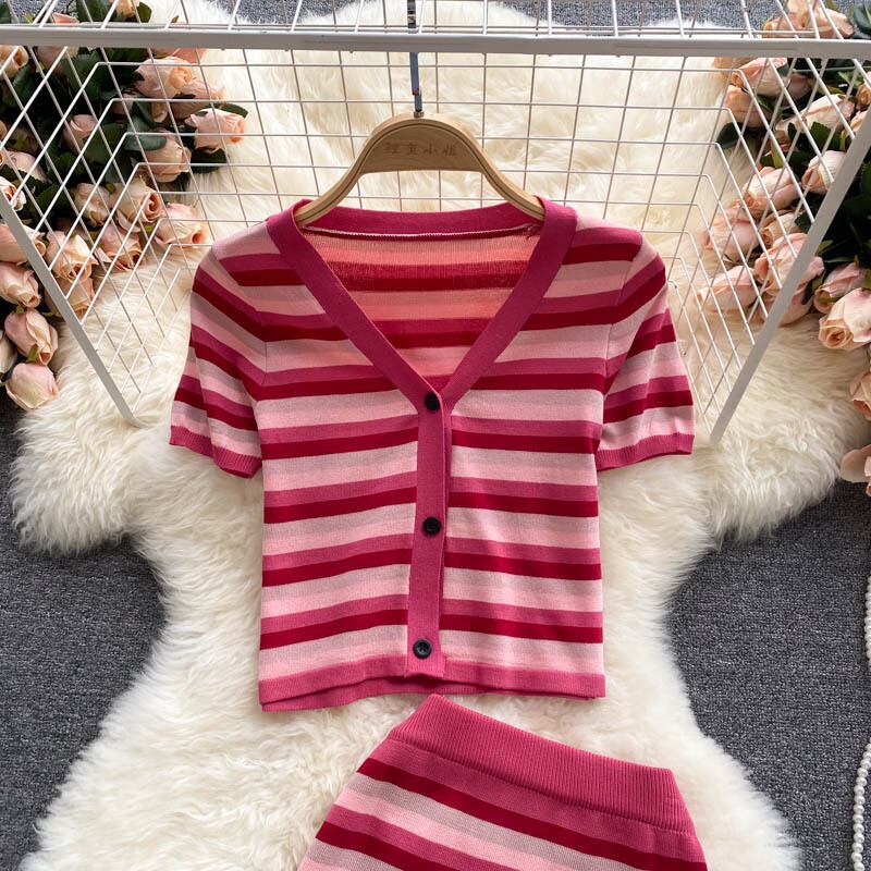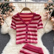 女性サマーレトロストライプニットセット半袖Vネックボタンショートトップ+ウエストスリムショートスカートツーピーススーツ ハーフスリーブ 夏物
