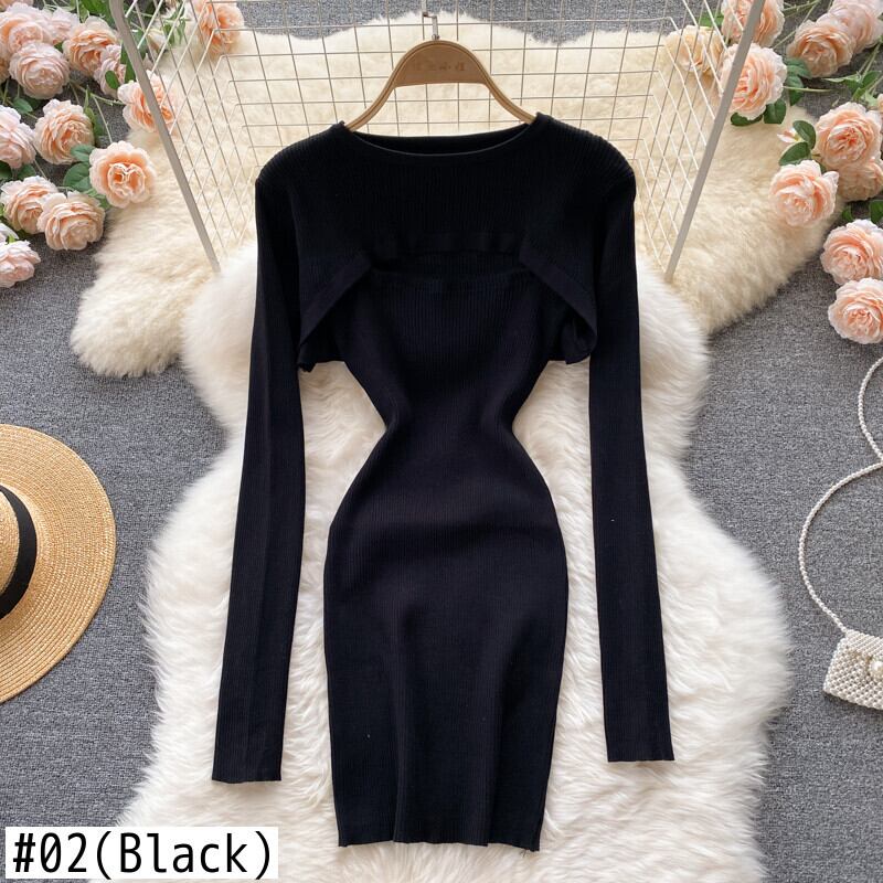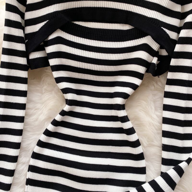 女性秋冬レトロストライプニットセット長袖Oネックショートプルオーバー+セクシーボディコンストラップワンピースツーピースセット ロング オータム 秋物 ウィンター 冬物
