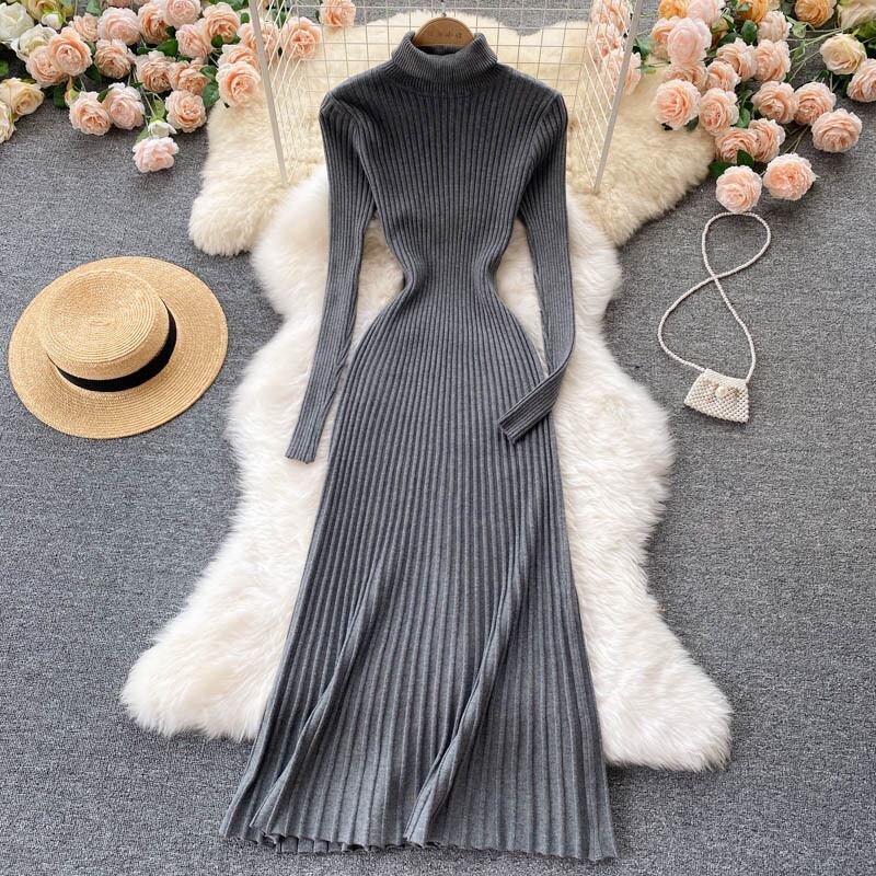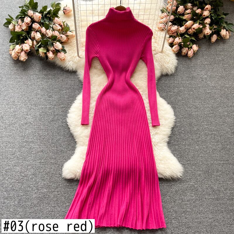 女性タートルネックプリーツニットドレス長袖伸縮性スリムドレス秋冬暖かいニットセータードレス ロング エラスティック オータム 秋物 ウィンター 冬物