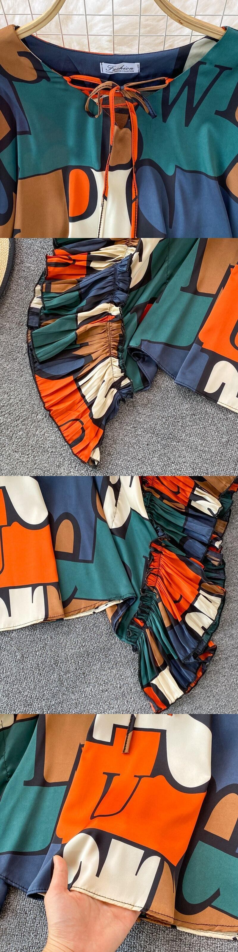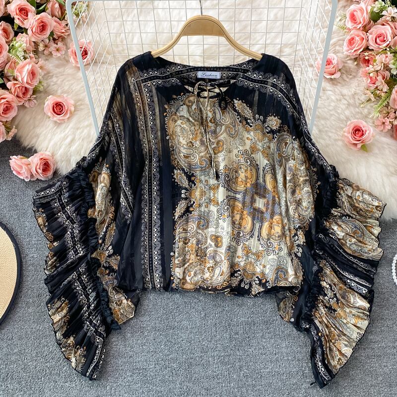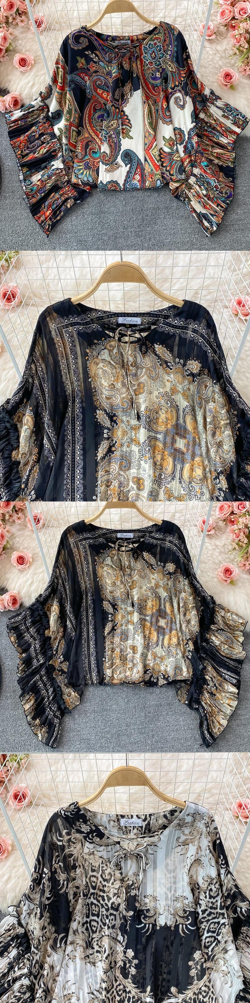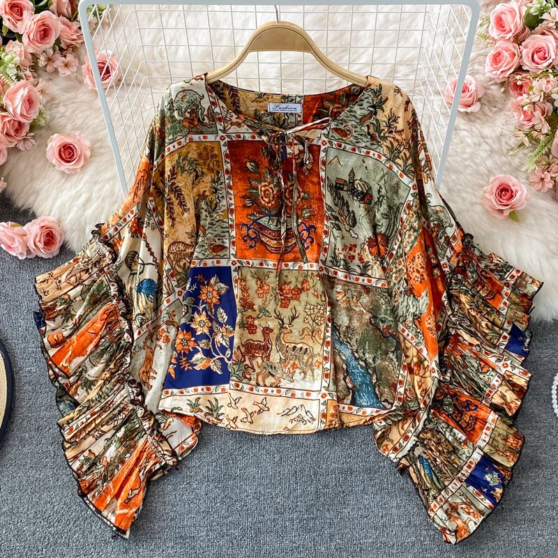 女性レトロプリントブラウスシックなバットウィングスリーブOネックルーズトップス秋のストリートウェアブラウス オータム 秋物